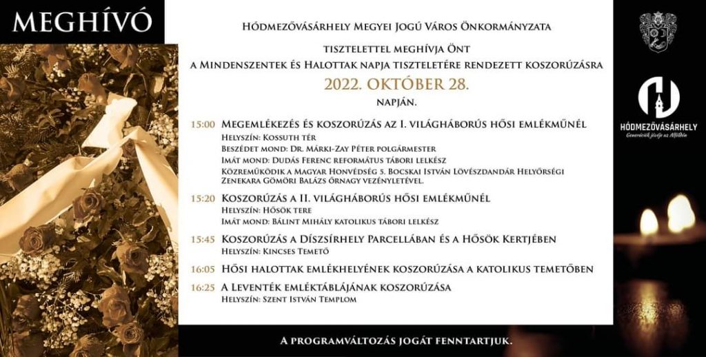 A halottak napja alkalmából koszorúznak ProgramVárosunk Írta: Korom András Megjelent: 2022. október 27. csütörtök Megosztás Pénteken kora délután rendez koszorúzást több helyszínen is a városi önkormányzat. Részletek kattintás után. halottakkoszorúzásmindenszentek Megosztás