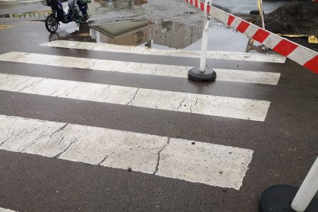 A kerékpárosnak a járművet tolva szabad átkelni a zebrán – alapesetben. A vásárhelyi Emlékpontnál ezt akkor sem tudnák megtenni, ha történetesen nem lenne az út egyik fele elzárva a forgalom elől és ezért klasszikus gyalogátkelőhelyként funkcionálna. Esős időben azonban akkora pocsolya gyűlik össze a kereszteződésben, hogy lehetelten száraz lábbal átmenni. Gyalogosként esetleg tehetünk egy kitérőt, bár ekkor az úttesten vagyunk kénytelenek kerülni. Szóval mindenképpen nézzük el átmenetileg a bicikliseknek is ezt a kis szabályszegést.