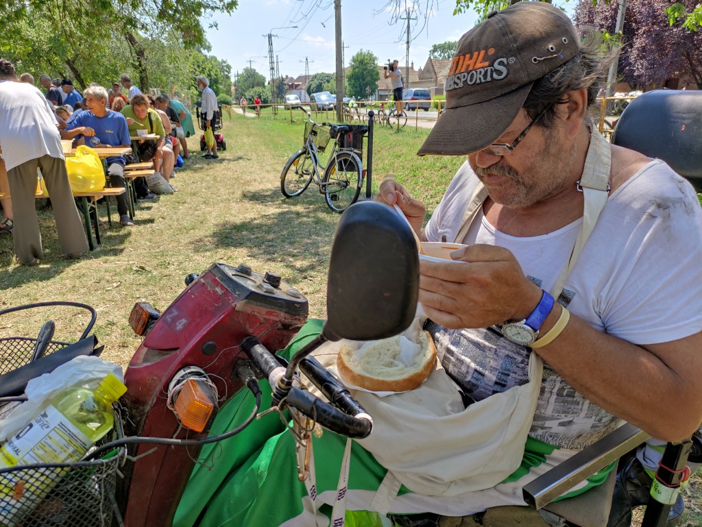 Míg a két kondérban rotyogó, mintegy százötven adag – Czeller Éva és csapata által készített – ételre vártak az emberek, addig ásványvizet osztottak szét közöttük. Majd az ételosztásra szépen sorba álltak, s előbb azok kapták meg a jó sűrű gulyást, akik helyben fogyasztották el, majd azok, akik haza szerették volna vinni. Az adagokat Bánfi István segítségével most is Márki-Zay Péter osztotta, míg a gulyáskrémet Berényi Károlytól vehették át azok, akik kértek ilyet. Akik közül sokan először mentek el elfogyasztani az ingyen ebédet.