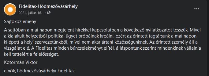 Amikor az ügy kirobban, a vásárhelyi Fidelitas elnöke az alábbi posztot tette közzé.