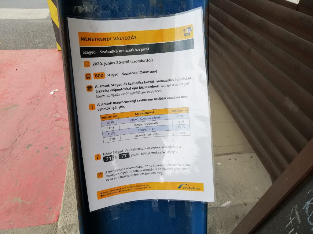 A mától érvényes – a hivatalos megfogalmazás szerint – ideiglenes járványügyi menetrend a térséget abból a szempontból érinti, hogy Budapest és Szeged között megszűnik az autóbusz-közlekedés. Azért, szól az indoklás, mert a továbbiakban a vasúti közszolgáltatás biztosítja a kapcsolatot a csongrád-csanádi megyeszékhely és a főváros között. A közlemény nem tér ki ennél részletesebben a járatkora, de információink szerint ez csak a közvetlenül, rövid útvonalon közlekedő buszokra érvényes, azokra, amelyek a megye többi városát érintve járnak a fővárosba, nem. A Szeged–Szabadka viszonylaton továbbra is igénybe vehetők az autóbuszok.