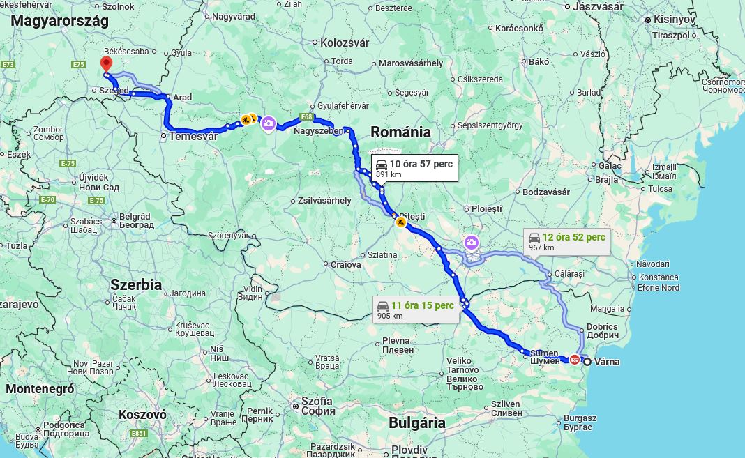 A szabadtéri skanzenben várakozó szarvasok mellett ott az a sárga bicikli, melyen – az épület bejárata felett – évtizedeken keresztül egy bábu kerékpározott, de ott egy útjelző tábla is, mely utca felőli részén leolvasható, hogy Várna – 2025-ben – 697 kilométerre van innen. A Google térképe szerint a távolság Vásárhely és a bolgár tengerparti város között – közúton – ennél egy kicsit több. És ha nincs forgalom az úton, röpke 11 óra alatt közúton gyorsan el is érhető.
