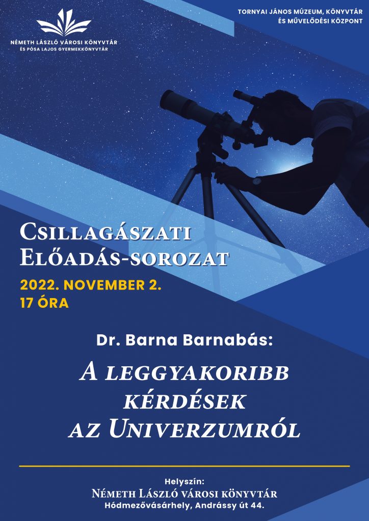 A Németh László Városi Könyvtár csillagászati sorozatának következő alkalmán 2022. november 02-án (szerdán) 17 órakor Dr. Barna Barnabás: A leggyakoribb kérdések az Univerzumról című előadását hallgathatjuk meg.