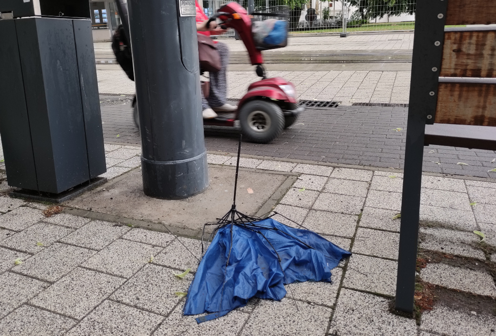 Kétszer is a városközpontban csapott le a villám, sok helyen az áram is elment, s sötét fellegek uralták a ma reggelt. A képen: a zivatarban tönkrement esernyő az Andrássy úton