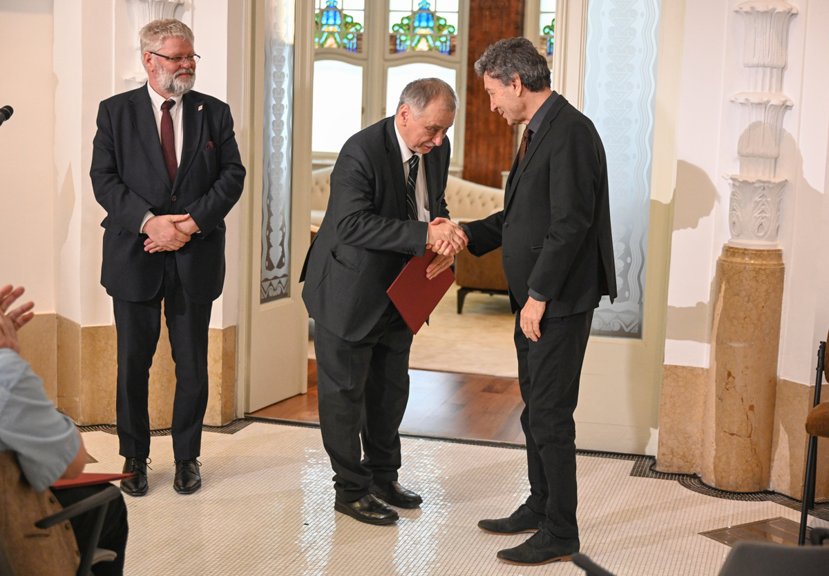 Turi Attila, a Magyar Művészeti Akadémia elnöke és Balázs Mihály építész, az MMA Oktatási, Képzési, Tudományos Bizottságának elnöke adták át az elismerő okleveleket a művészetoktatás területén kimagasló eredményt elért szakembereknek december 4-én az MMA Akadémiai Klubjában.