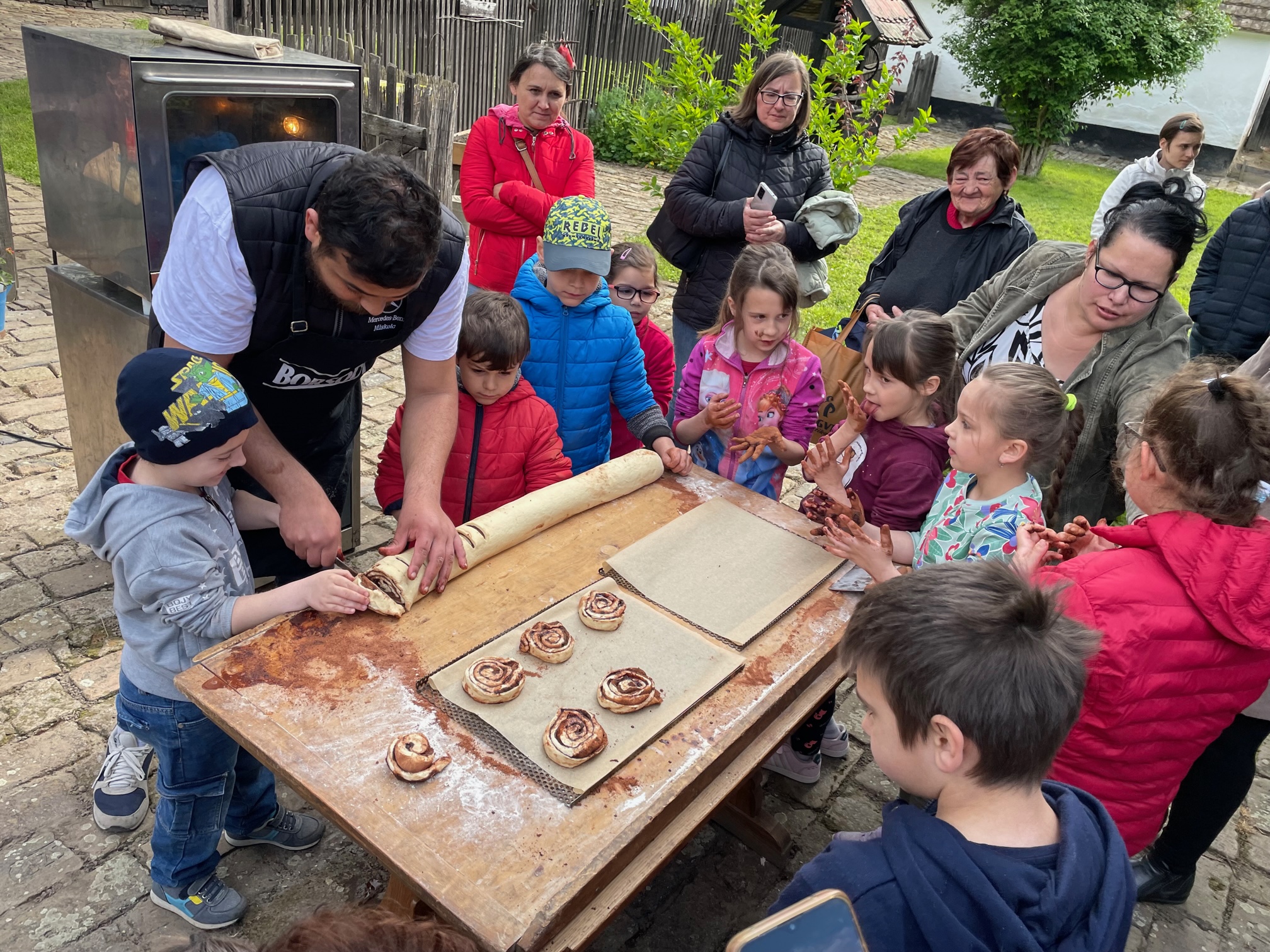 Szombat délelőtt nem csak a gyerekek tanulhattak kakaós csigát sütni. A több turnusban elkészített péksütemények mindenkinek ízlettek. Amíg az utolsó adag sült, Alex a Tájháznál egybegyűlteknek is elmondta élettörténetét.