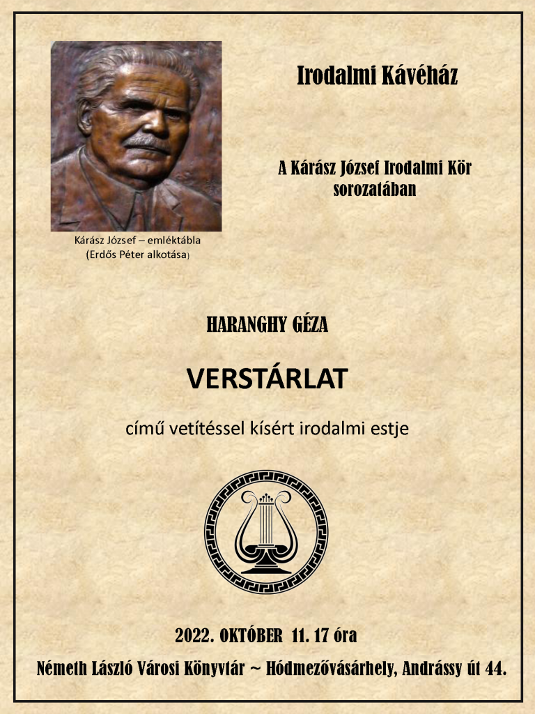 2022. október 11-én (kedden) 17 órakor kezdődik Haranghy Géza Verstárlat című vetítettképes irodalmi estje a Németh László Városi Könyvtárban.