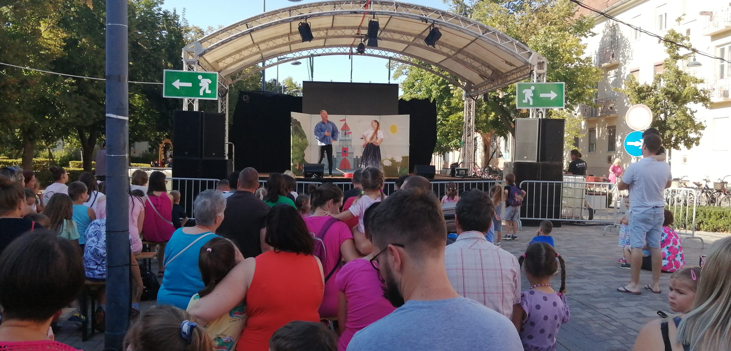 A Léghajó Meseszínház délután ötkor kezdődő, “Három kívánság” című előadására megteltek a padok a BFMK melletti kisszínpad előtt. A kéttagú társulat interaktív előadása láthatóan elbűvölte a főként óvodás korosztályú gyerekeket, akik nemcsak nézői, de a mese folyamán annak táncoló, éneklő résztvevőivé is válhattak.