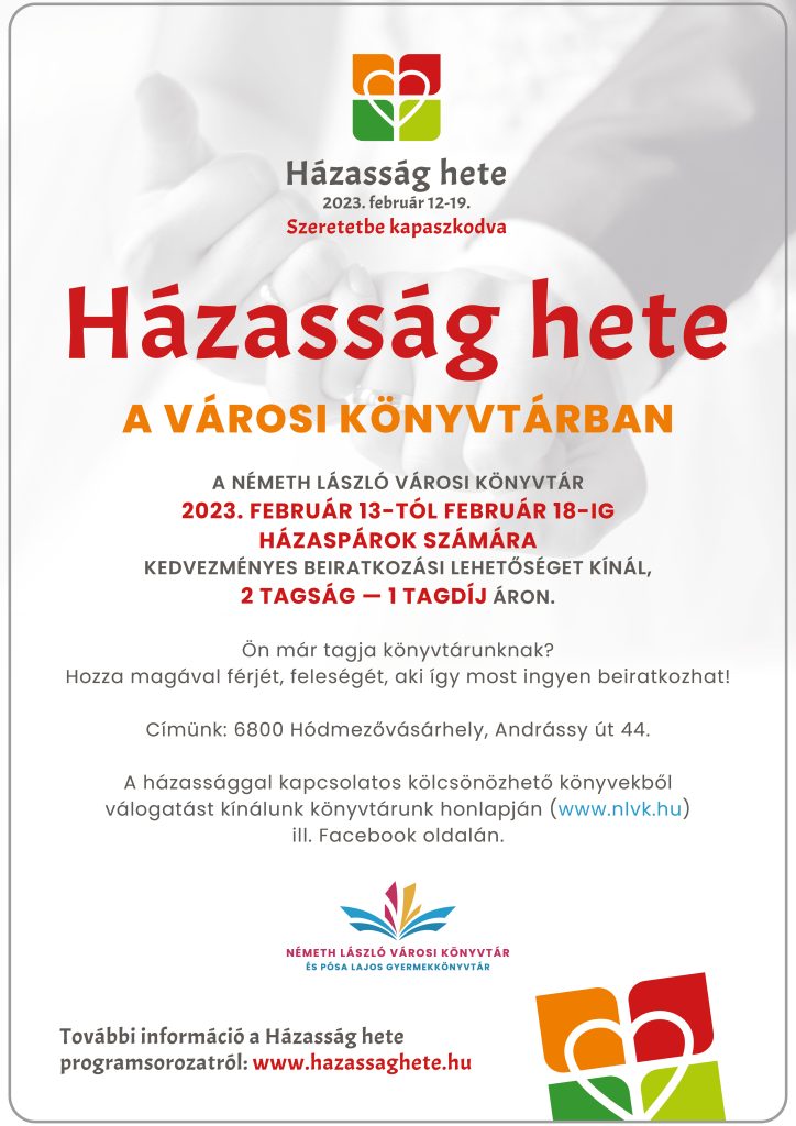 Február 13-18. között a HÁZASSÁG HETE alkalmából beiratkozási akcióval (2 tagság – 1 tagdíj) várják a házaspárokat a vásárhelyi könyvtárba.