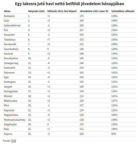 A portál a 2011-2021 közötti időszakot vizsgálta. Az adatok szerint a 26-os listán Hódmezővásárhely a 23., két helyet javítva 10 év alatt. Azonban az egy főre jutó nettó jövedelem 118 ezer forint, ami 149 százalékos növekedést mutat 2011-hez képest. A többi városhoz képest Nagykanizsa (-6), Dunaújváros (-5), Eger (-4) és Zalaegerszeg (-4) rontott leginkább a pozícióján.