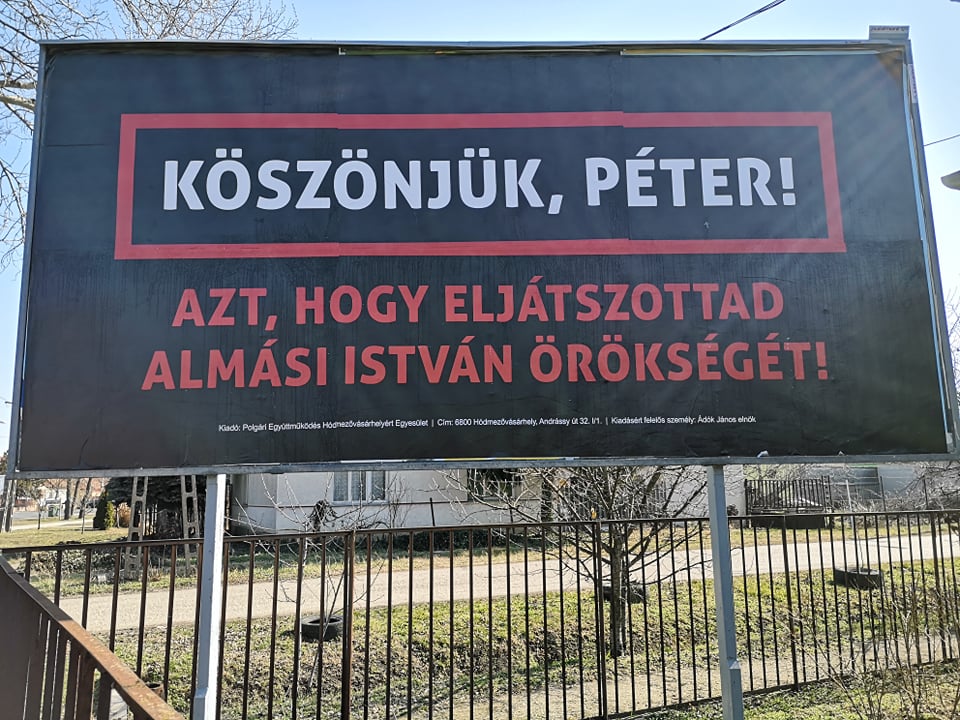 A 2017 végén elhunyt egykori polgármester, Almási István neve is rákerült azon plakátok egyikére, melyeket a Polgári Együttműködés Hódmezővásárhelyért Egyesület helyezett ki városunk több pontján mára virradóra. Az egyesület kapcsán, egy tavalyi ugyanilyen akciójukról az elnökük, Ádók János közéleti szereplésével összefüggésben nemrég írtunk. Az időpont választása talán nem a véletlen műve: ma két éve, 2018. február 25-én nyert időközi választást Márki-Zay Péter polgármester. Egyelőre háromféle szöveggel láttunk plakátokat. A témára később biztosan visszatérünk majd.