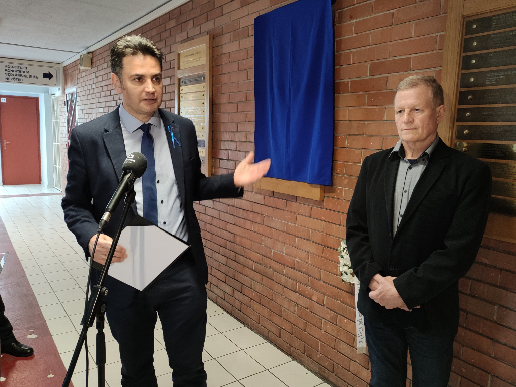 Néhai Pánczél Tamás vízilabdázó, edző, úszóoktató és Szathmári Zoltán egyetemi tanár, akrobata edző neve is felkerült a Hódtói Sportcsarnok dicsőségfalára. A képen Márki-Zay Péter és Szathmári Zoltán.