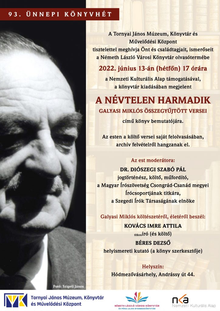 A Nemzeti Kulturális Alap támogatásával, a Németh László Városi Könyvtár kiadásában megjelent A névtelen harmadik : Galyasi Miklós összegyűjtött versei című könyv bemutatója 2022. június 13-án (hétfőn) 17 órakor lesz.
