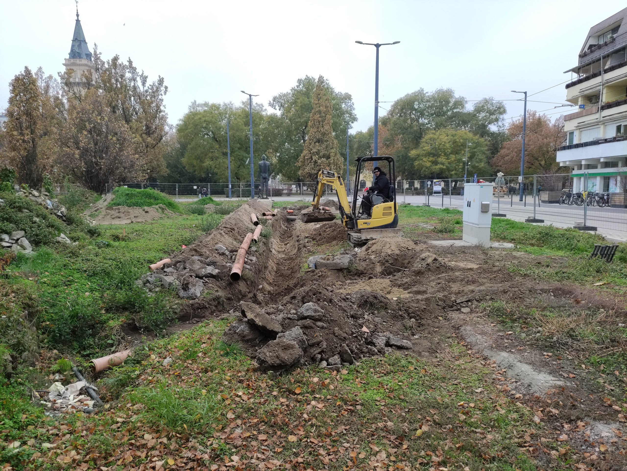 Szép műszaki szakszóval közműkiváltás zajlik a Kossuth tér azon Sarokház előtti részén, melyről az munkálatokat eredetileg elnyerő fővárosi Trigo-Home Kft. 30 százalékos készültség után levonult, s mely építését az újabb közbeszerzési pályázaton a szegedi Ferroép Zrt. nyerte el.
