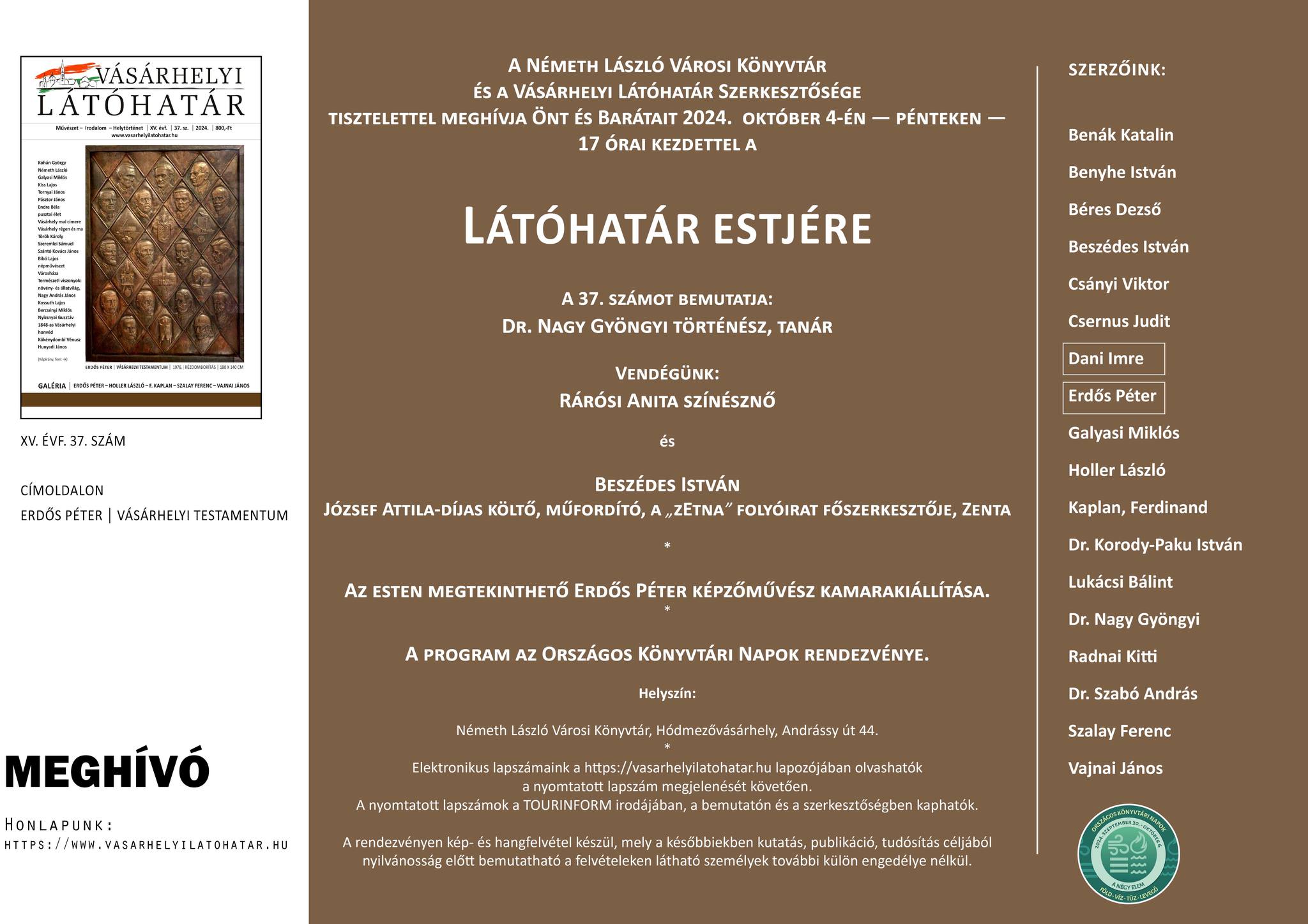 A 37. Vásárhelyi Látóhatárt mutatják ma ma este a Németh László Városi Könyvtárban. A folyóiratot Nagy Gyöngyi történész, tanár mutatja be. Vendég: Rárósi Anita színésznő és Beszédes István, József Attila-díjas költő, műfordító. Részletek lentebb.