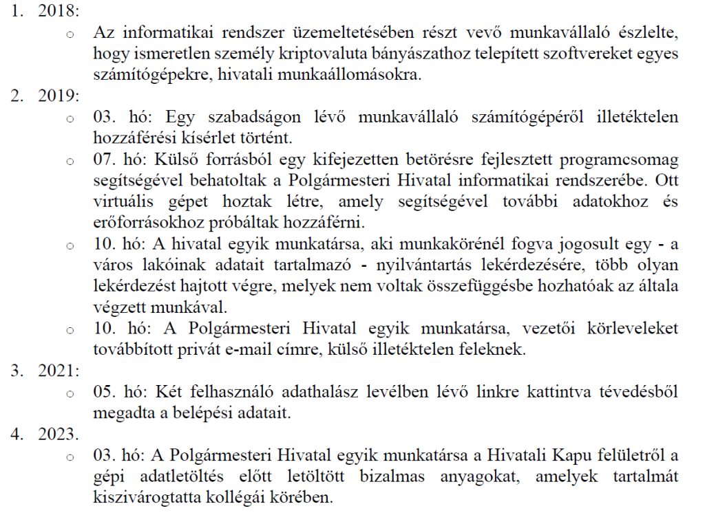 Az előterjesztések közt olvasható, a 2018-2023 május 12. közötti információbiztonsági és adatvédelmi incidensekről szóló beszámolóban Gortva Tamás információbiztonsági felelős és Juhász Róbert adatvédelmi tisztviselő négy a polgármesteri hivatalt érintő estet összegez.