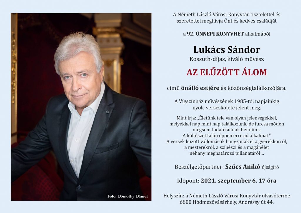 Lukács Sándor Kossuth-díjas, kiváló művész Az elűzött álom címmel tart önálló estet és közönségtalálkozót 2021. szeptember 6-án (hétfőn) 17 órakor a Németh László Városi Könyvtárban.