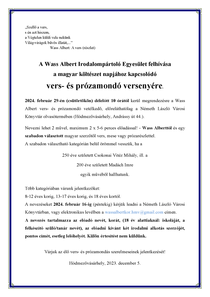 Már lehet nevezni a vers- és prózamondó versenyre KultúraVárosunk Írta: Korom András Megjelent: 2024. január 17. szerda Megosztás Február 16-ig lehet jelentkezni a Wass Albert Irodalompártoló Egyesület vers- és prózamondó versenyére. HódmezővásárhelyVásárhelyvásárhelyi hírekWass Albert Irodalompártoló Egyesület Megosztás
