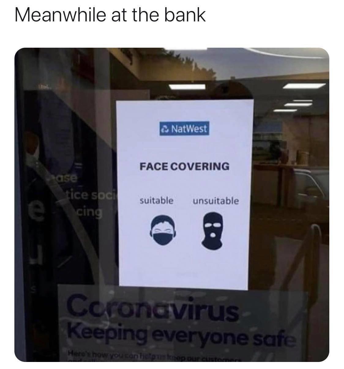 Korábban több hazai pénzintézet ajtaján is kinn volt, hogy maszkban tilos bemenni, ma meg már ugye anélkül nem engednek be/kéne, hogy beengedjenek. Szóval a kérdés, hogy milyen is az a maszk.