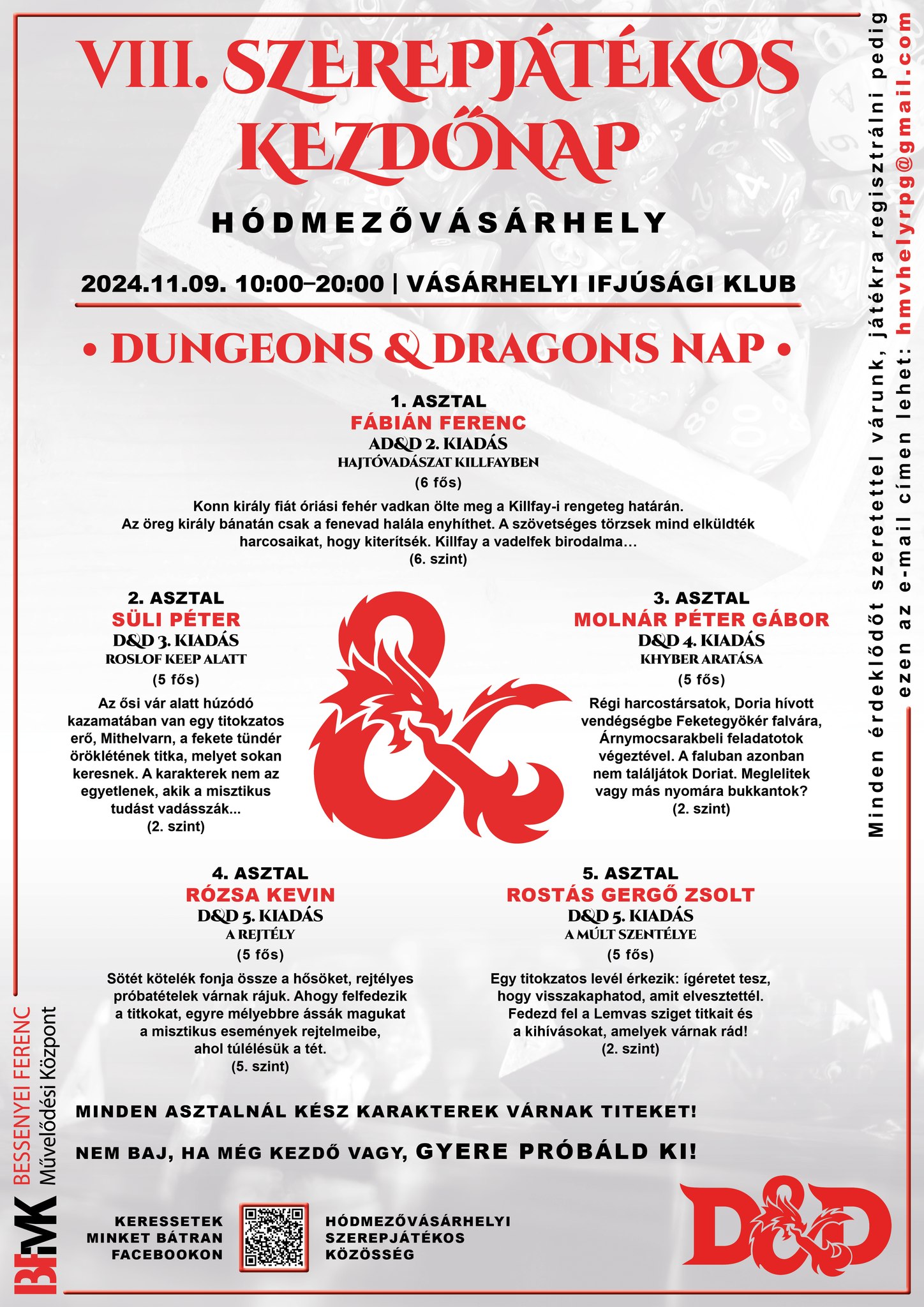 Szombaton, november 9-én délelőtt 10 és este 8 között szerepjátékos napot tartanak az Ifjúsági Klubban. A játékra lehet regisztrálni a plakáton megadott elérhetőségen és a teljesen kezdő játékosokat is várják. MIndenkit kész karakterek várnak majd, több asztalnál folyik majd a játék.