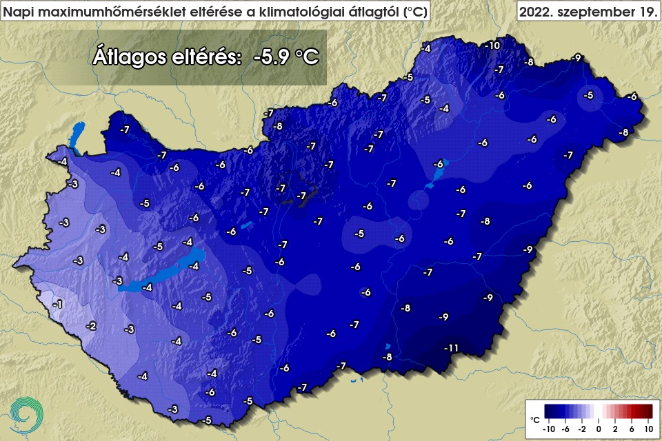 Átlagosan 5,9 fokkal volt alacsonyabb a hőmérséklet csúcsértéke hétfőn az országban, mint ilyenkor szokásos – derül ki az Országos Meteorológiai Szolgálat térképéből, amelyet kedden tettek közzé közösségi oldalukon.