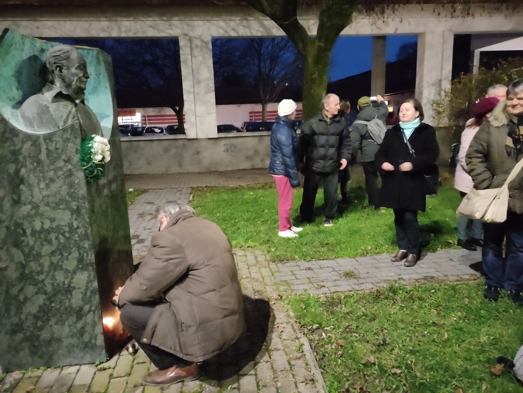 A helyi Wass Albert Irodalompártoló Egyesület tagjai és az érdeklődők az előadás előtt gyertyát gyújtottak a kör névadója a könyvtár előtt álló mellszobra előtt az író születésének 115. évfordulója tiszteletére.