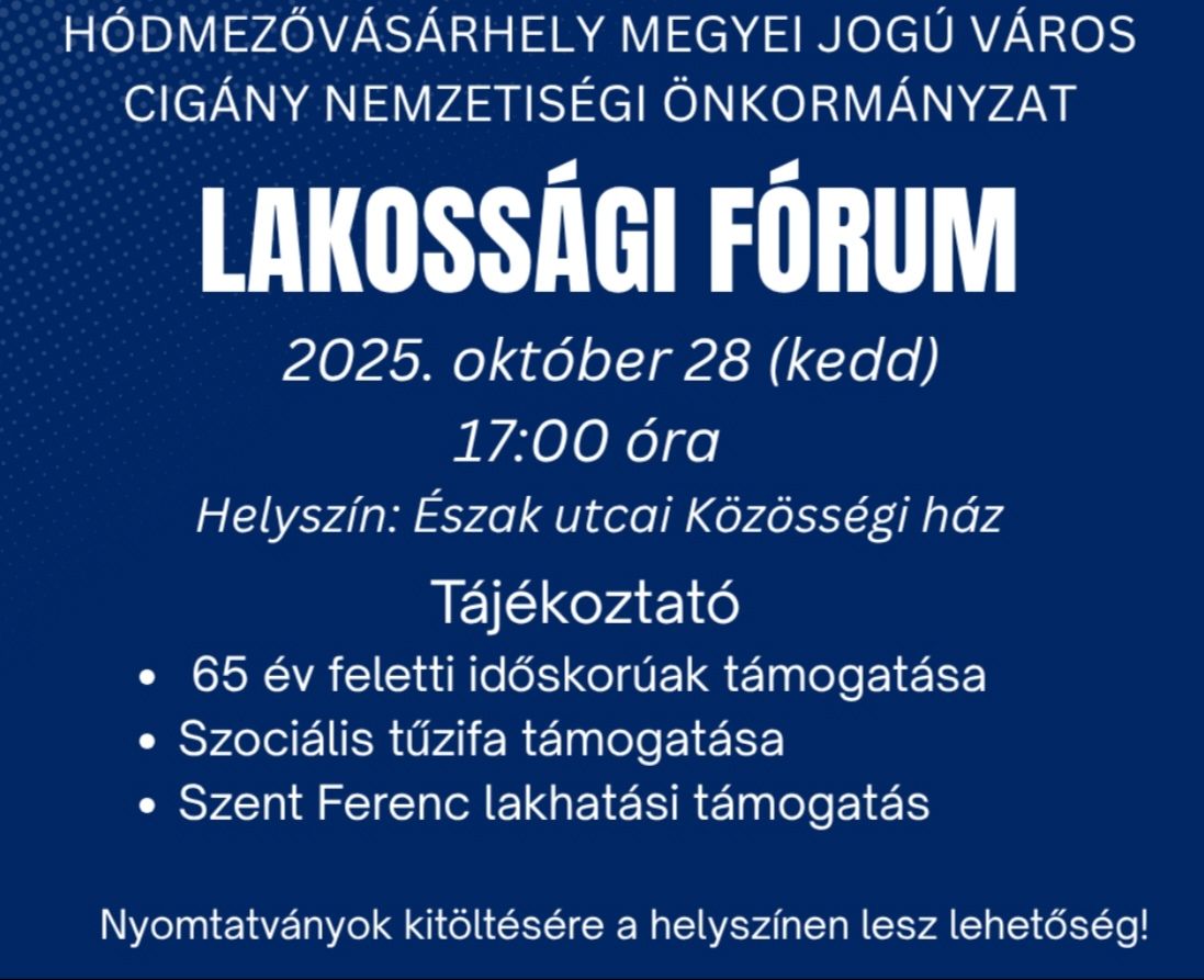 Lakossági fórumot tart a Cigány Nemzetiségi Önkormányzat október 28-án, kedden 17 órától az Észak utcai közösségi házban. Több témával is készülnek, tájékotatást nyújtanak majd az idősek támogatásáról, a szociális tűzifa igényléséről valamint a Szent Ferenc lakhatási programjáról. A CNÖ képviselői a helyszínen segítenek a nyomtatványokat is kitölteni.