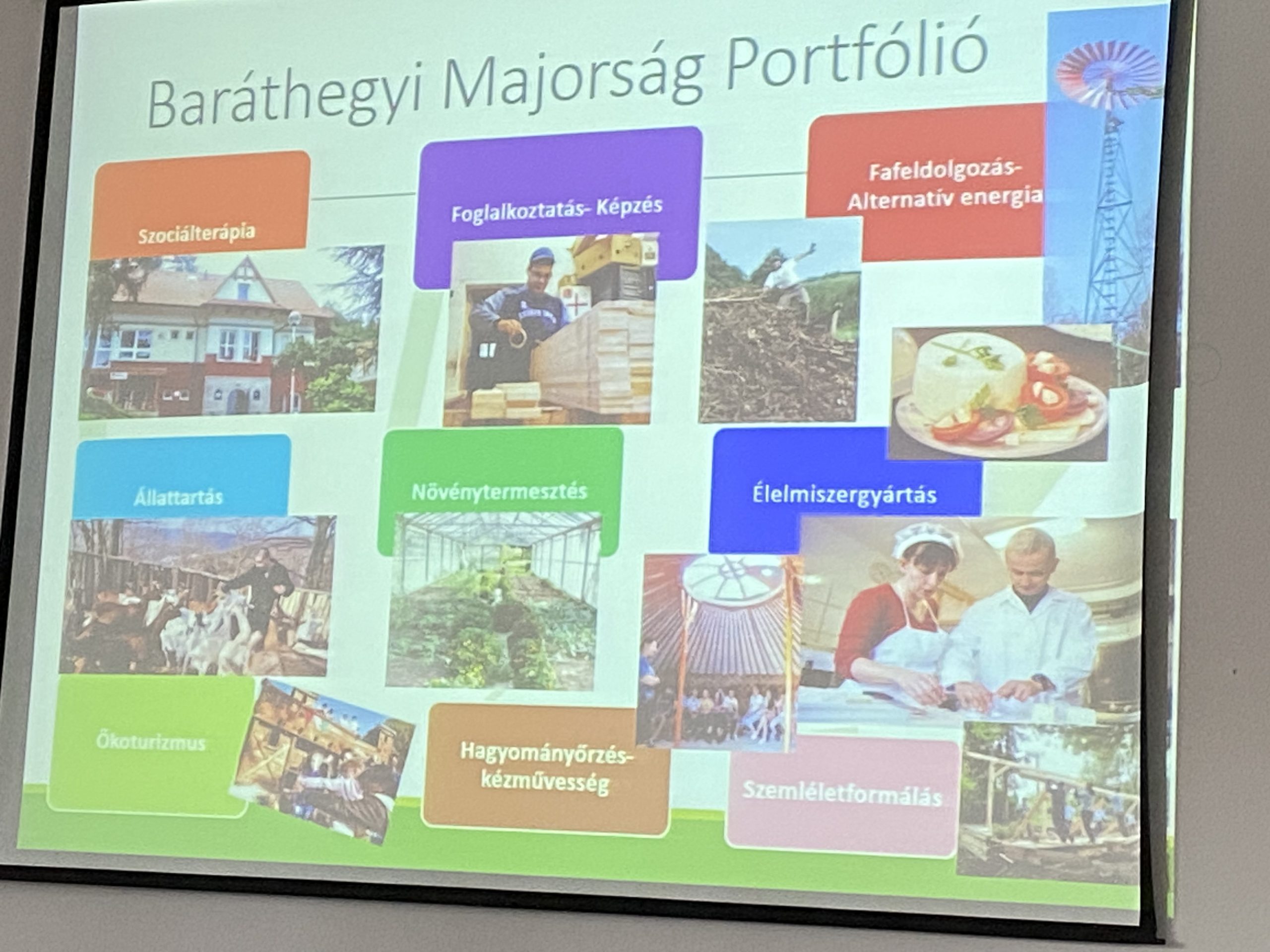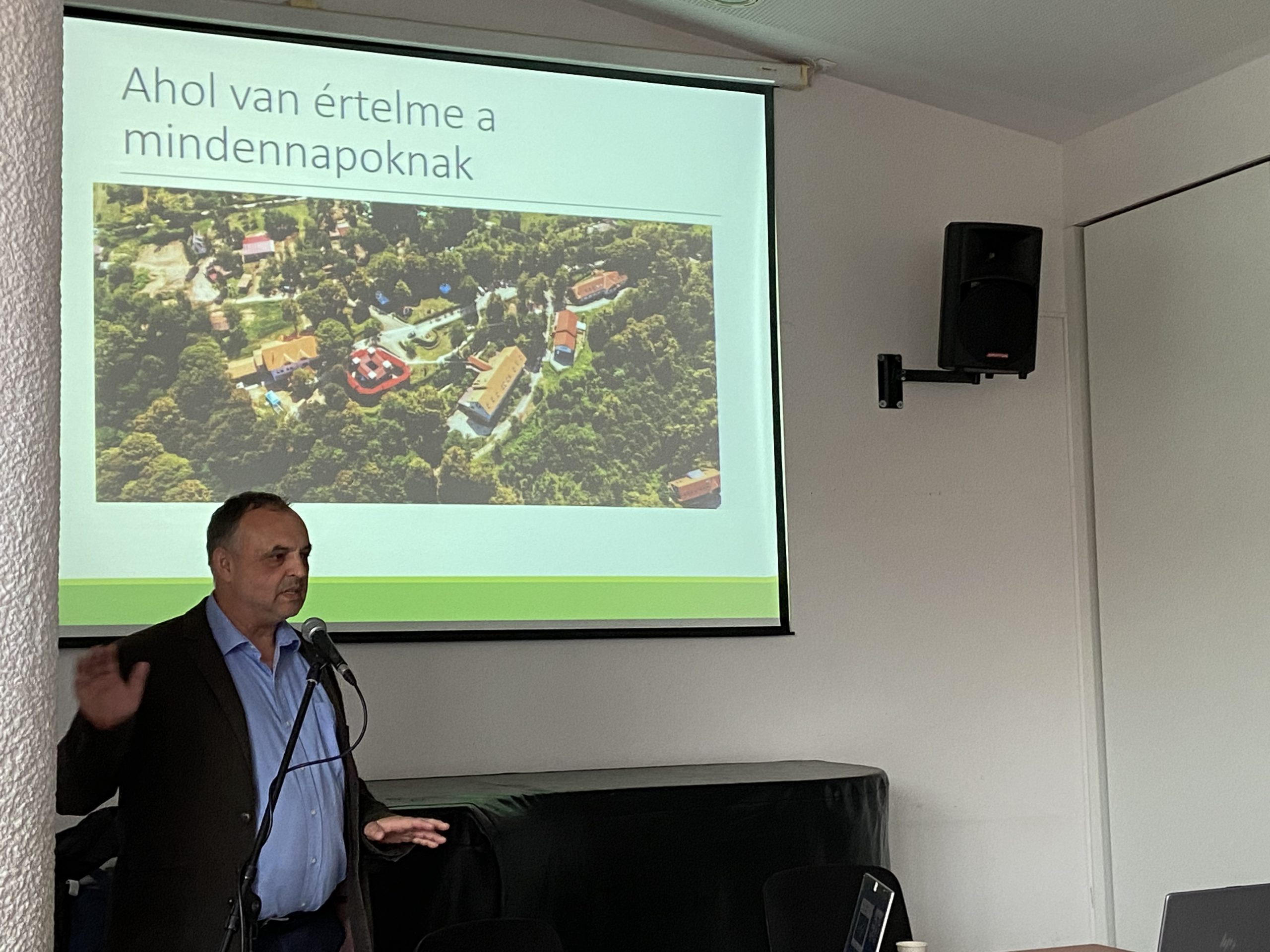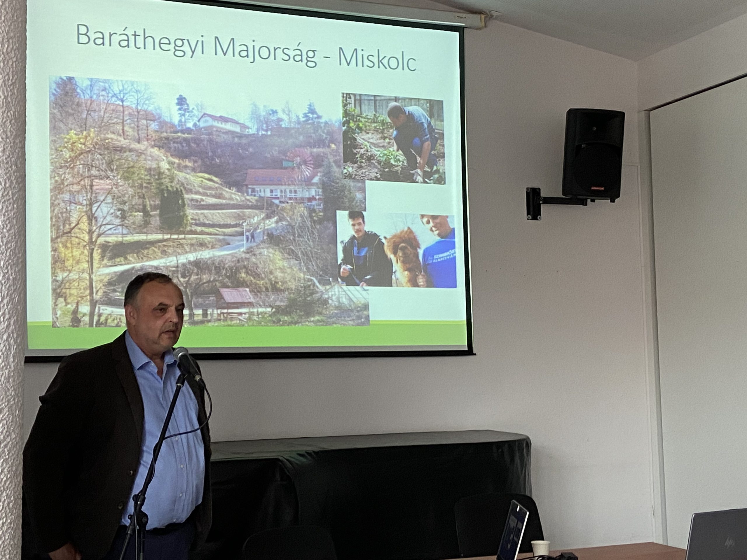 Jakubinyi László, a „magyar meseország”-nak is aposztrofált Baráthegyi Majorság – Szociális Farm megálmodója, létrehozója és vezetője ezt követően egy érdekfeszítően színes előadás keretében számolt be arról, hogyan indította el, hogyan és miből tartja fenn az általa alapított miskolci Szimbiózis Alapítvány azt az intézményegyüttest, ahol már több mint harminc éve dolgozik a fogyatékos emberek életminőségének javításán.