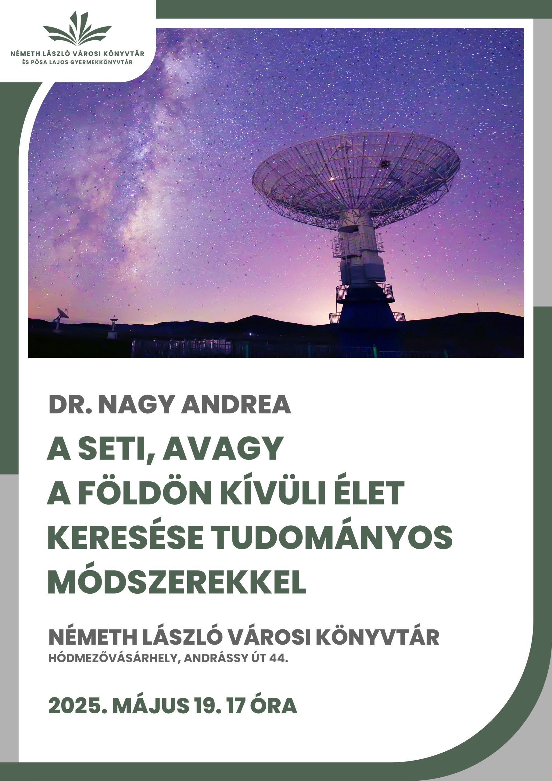 A SETI, avagy a földön kívüli élet keresése tudományos módszerekkel címmel tart előadást hétfőn délután 5 órától Nagy Andrea csillagász, asztrofizikus a Németh László Városi Könyvtárban.