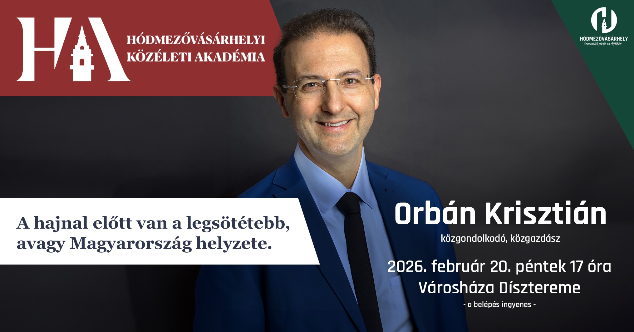 A Hódmezővásárhelyi Közéleti Akadémia következő alkalmán egy különleges előadással várják az érdeklődőket: Orbán Krisztián, közgazdász és közíró „A hajnal előtt van a legsötétebb, avagy Magyarország helyzete” címmel tart előadást.