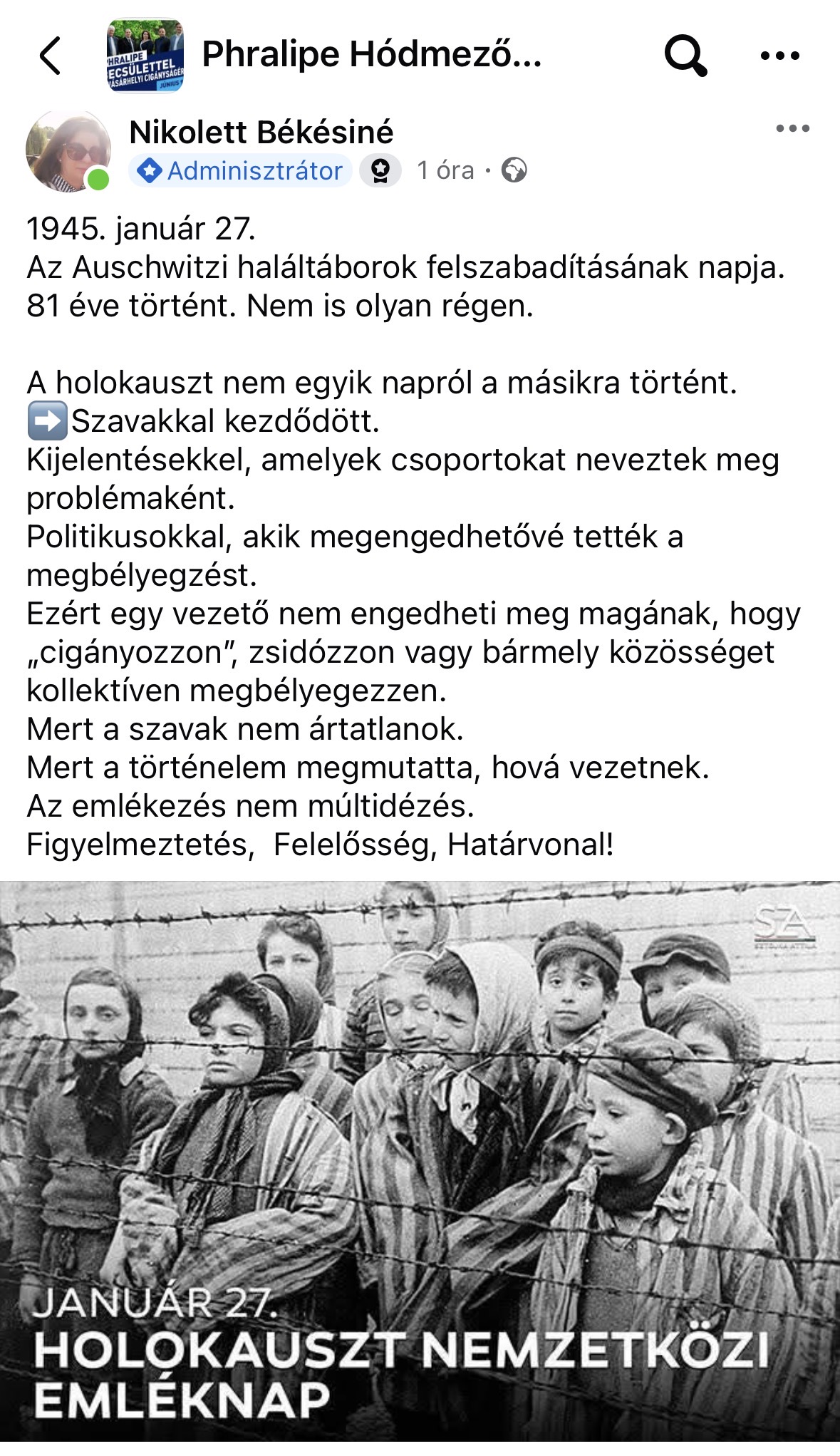„1945. január 27. Az auschwitzi haláltáborok felszabadításának napja. 81 éve történt. Nem is olyan régen.” – ezzel a mondattal kezdődik a Phralipe Hódmezővásárhely közösségi oldalán megjelent megemlékezés, amely nemcsak a múltra emlékeztet, hanem a jelenhez is kérlelhetetlenül szól. Nem hagy kényelmes távolságot, nem engedi meg azt a hamis biztonságérzetet, hogy mindez „régen volt”, és velünk már nem történhet meg.
