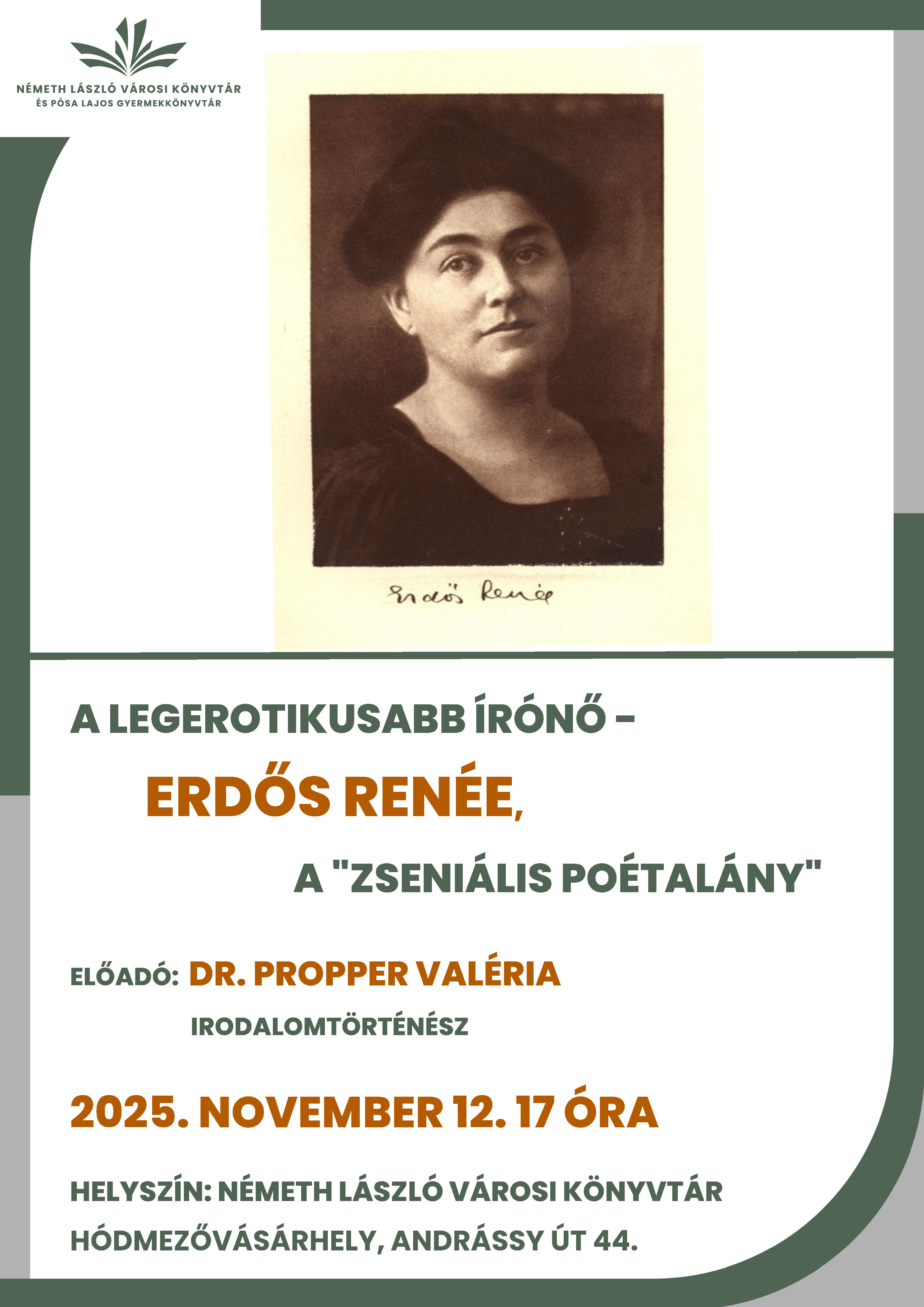 Propper Valéria irodalomtörténész vetítéses előadását hallgathatják meg az érdeklődők szerdán este 5 órától Erdős Renée életéről, műveiről, irodalomtörténeti megítélésének változásairól.