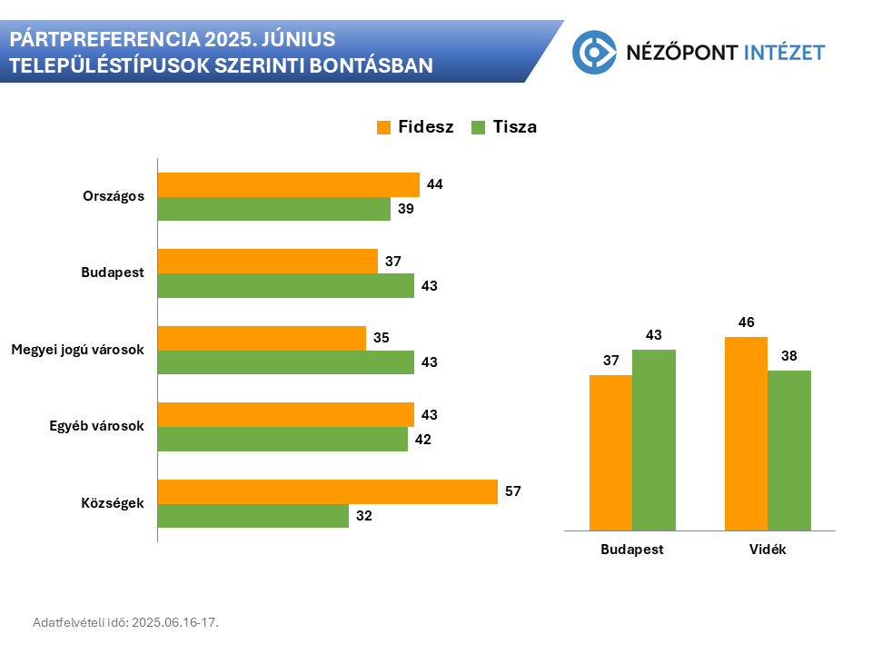 A Nézőpont Intézet júniusi közvélemény-kutatása alapján a Fidesz közel nyolc százalékpontos előnnyel (46 százalék) rendelkezik a fővároson kívül élők körében a Tisza Párttal (38 százalék) szemben. A kormánypártok legnagyobb arányú szavazótábora az ország nagyobb részét lefedő községekben élők (57 százalék) körében van, ahol a Tisza Párt mindössze 32 százalékos támogatottsággal rendelkezik. Az egyéb városok választói körében egy százalékpontos előnye van a Fidesznek (43 százalék) a legnagyobb ellenzéki párttal (42 százalék) szemben.