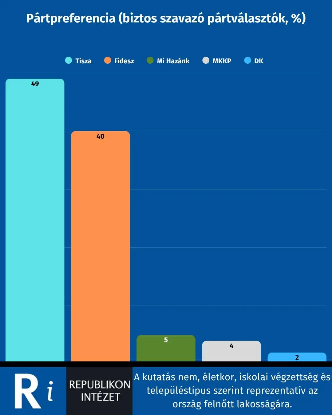 A Republikon szerint Magyar Péterék a teljes népességben 6 százalékponttal növelték az előnyüket, a Tisza Párt 37 százalékon, míg a Fidesz–KDNP 31 százalékon áll. A pártválasztók, valamint a biztos szavazó pártválasztók körében 9–9 százalékpontos a Tisza Párt előnye, mindkét esetben 49–40 az állás.