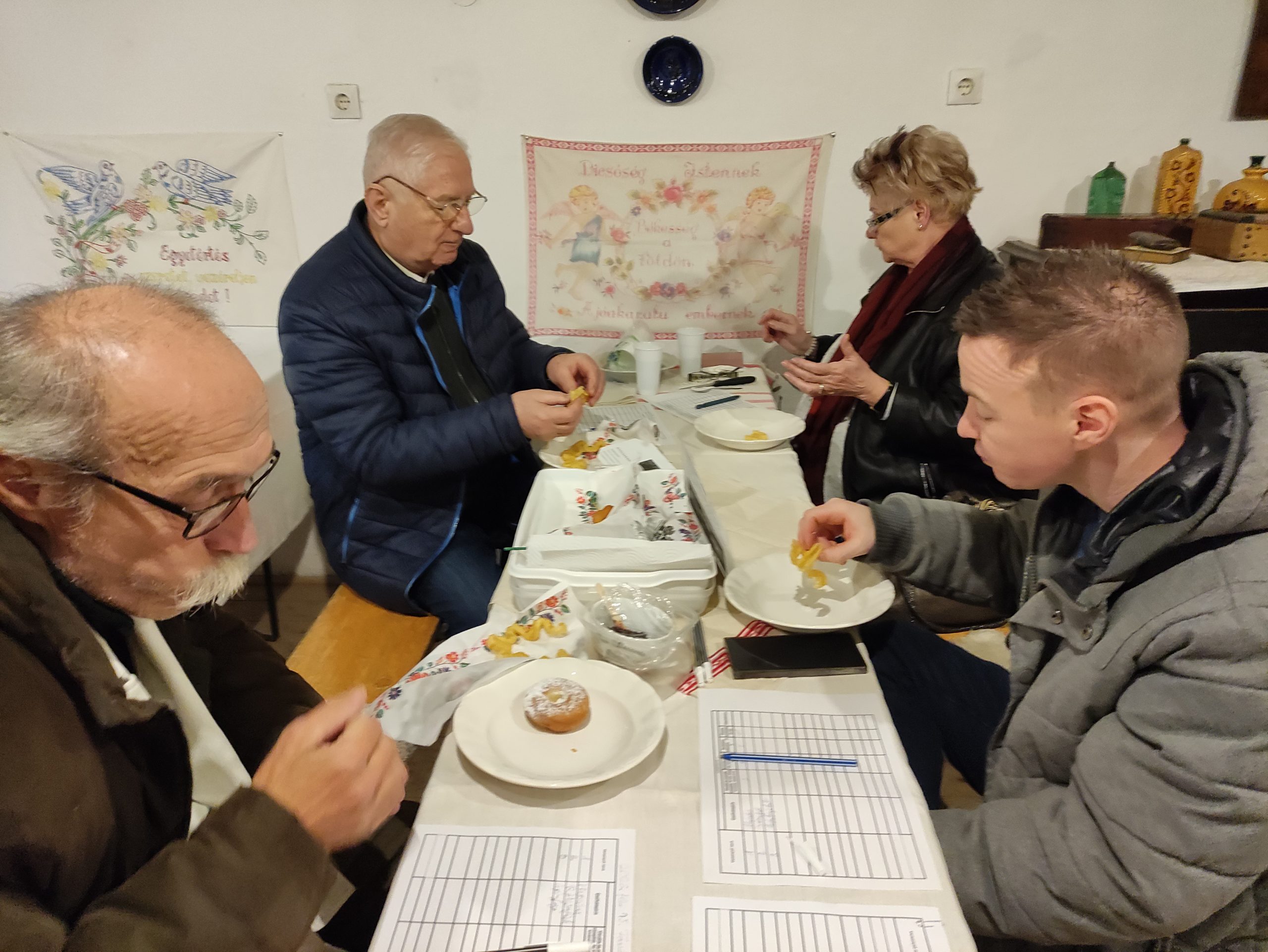 Nagy izgalommal várta a vasárnapi bírálatra beérkező fánkokat a fánkmustra zsűrije, amely ezúttal az Árpád utcai tájházban ült össze, hogy megszemlélje és megkóstolja a mustrára benevezett különféle fánkokat – dacolva a hideg, havas esővel tarkított időjárással.