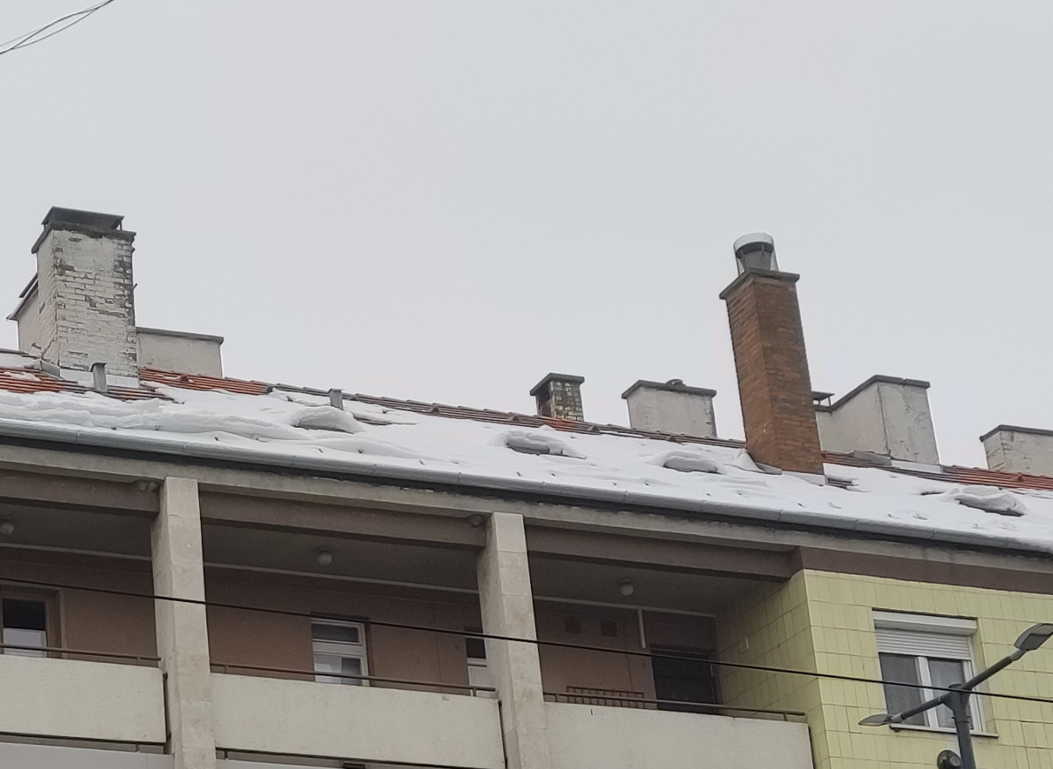 Az épület tetején nincs hófogó, igaz, azt már máshol tapasztaltuk, hogy ilyenkor az sem segít: a nagy mennyiségű, de olvadozó hó szépen átbukik felette, mintha ott sem lenne.