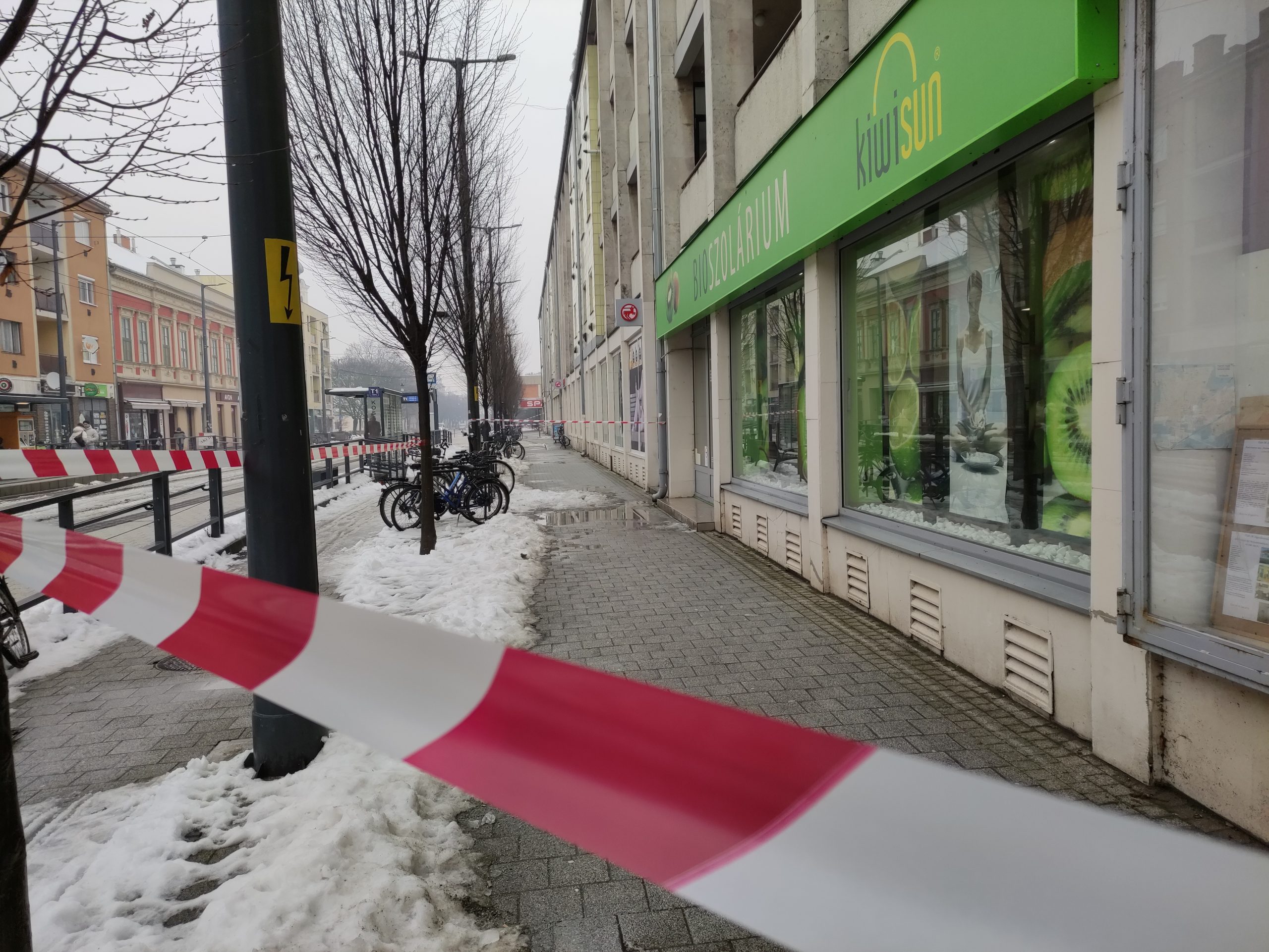 Hogy ne okozzon senkiben kárt az alábukó hótömeg, piros-fehér szalag tiltja meg a járdán való közlekedést délelőtt óta, úgy, hogy szemből bármelyik üzletbe be lehet menni.