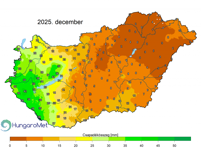 Az anticiklonos idő miatt a 2025-ös év utolsó hónapjában kevés csapadék hullott, a havi csapadék országos átlagban – az eddig beérkezett adatok alapján – csupán 13,8 mm, ami 70%-kal elmaradt az átlagtól (1991–2020-as átlag: 45,6 mm) és ezzel a 10. legszárazabb december 1901 óta.