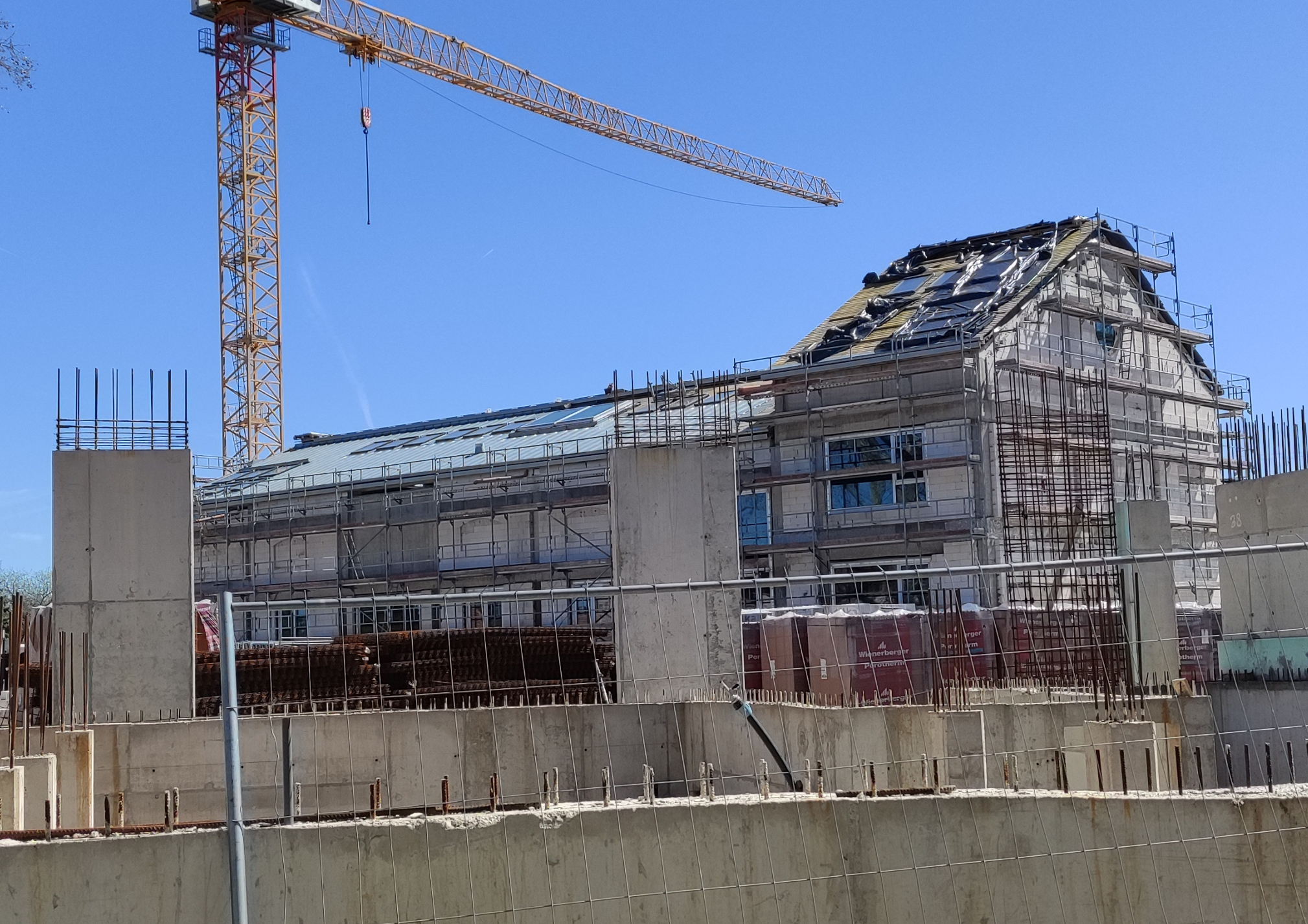 2024 nyarán még csak az épületek alapozását kezdték meg, illetve a meghagyott épületeket azok vázáig bontották. Tavaly decemberben pedig az akkor a kerítésre felhúzott zöld háló ellenére is jól látszódott, hogy az egykori udvari raktárak helyén új épületeket kezdtek építeni. Ezek egyike a fent említett.