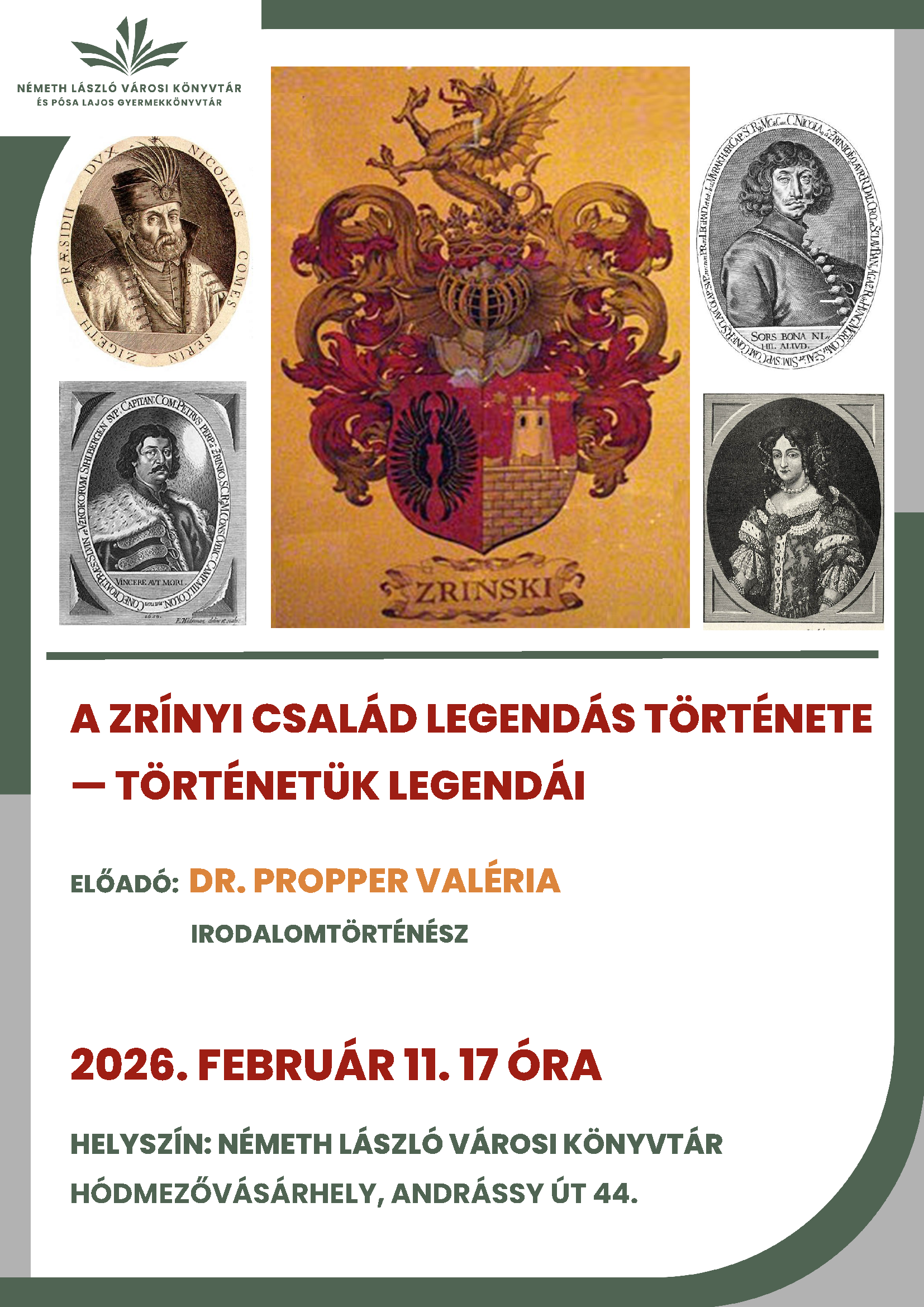 Szerdán délután 5 órakor folytatódik Propper Valéria irodalomtörténész előadássorozata. Ez alkalommal a Zrínyi család legendás történeteiről hallgathatnak előadást az érdeklődők.