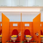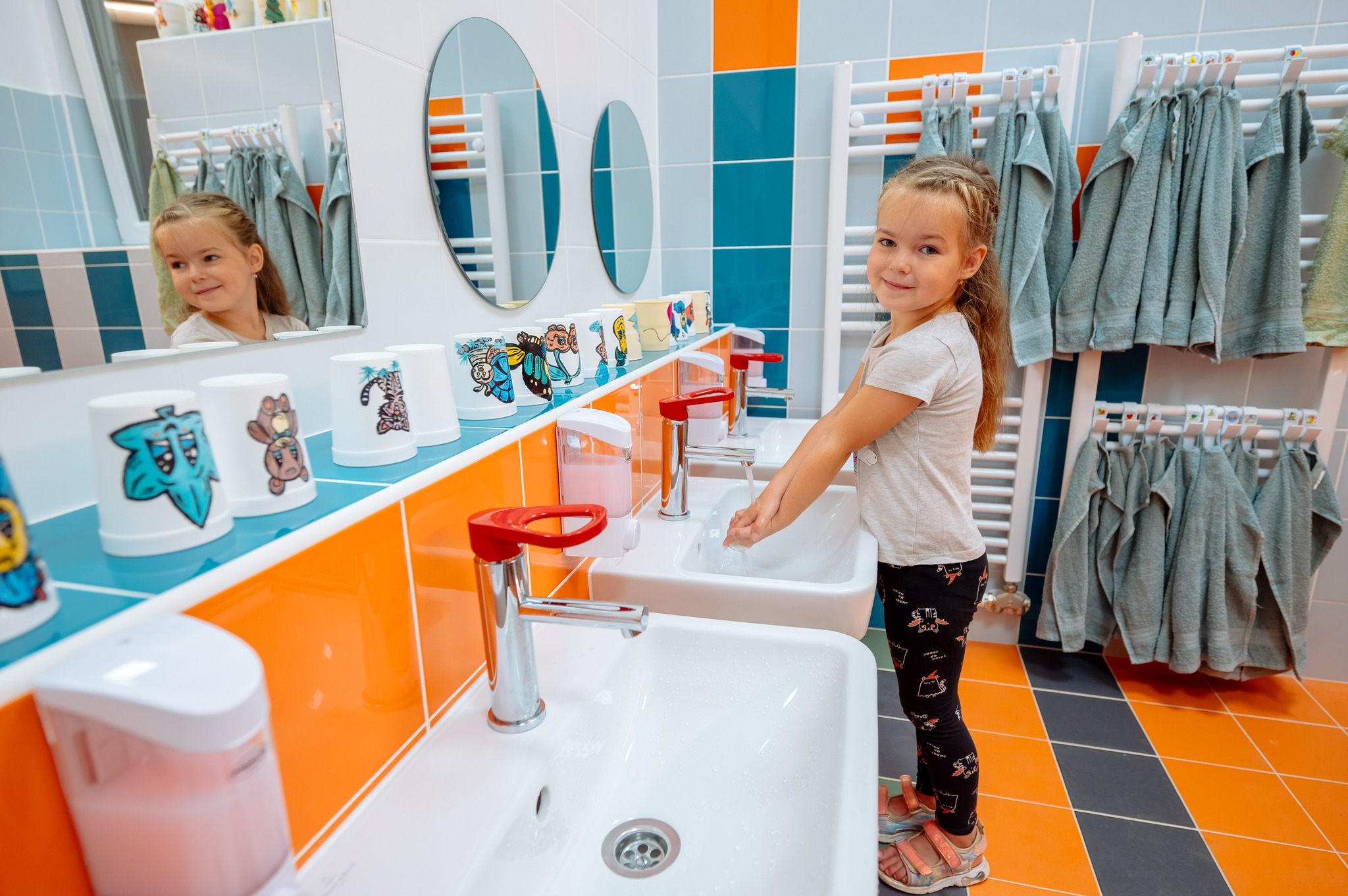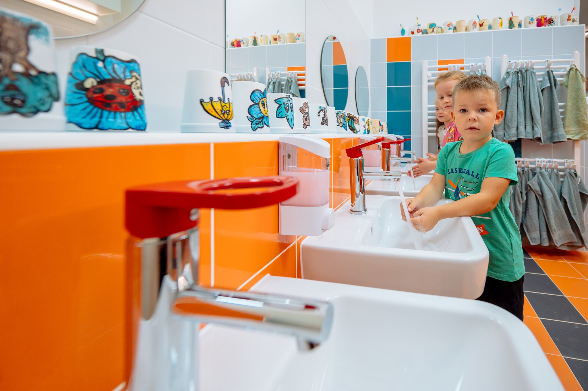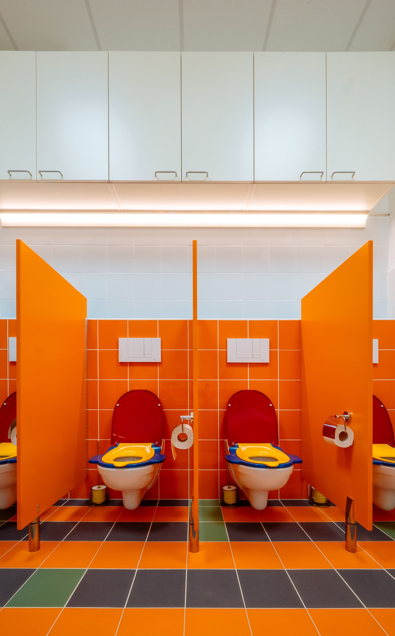 A vásárhelyi gyár jóvoltából kifejezetten a gyermekeknek kifejlesztett mosdókat, csaptelepeket és víztakarékos tartállyal működő gyermekvécéket telepítettek a kivitelezők a vizesblokkba, melyeket vidám színű burkolattal is elláttak.