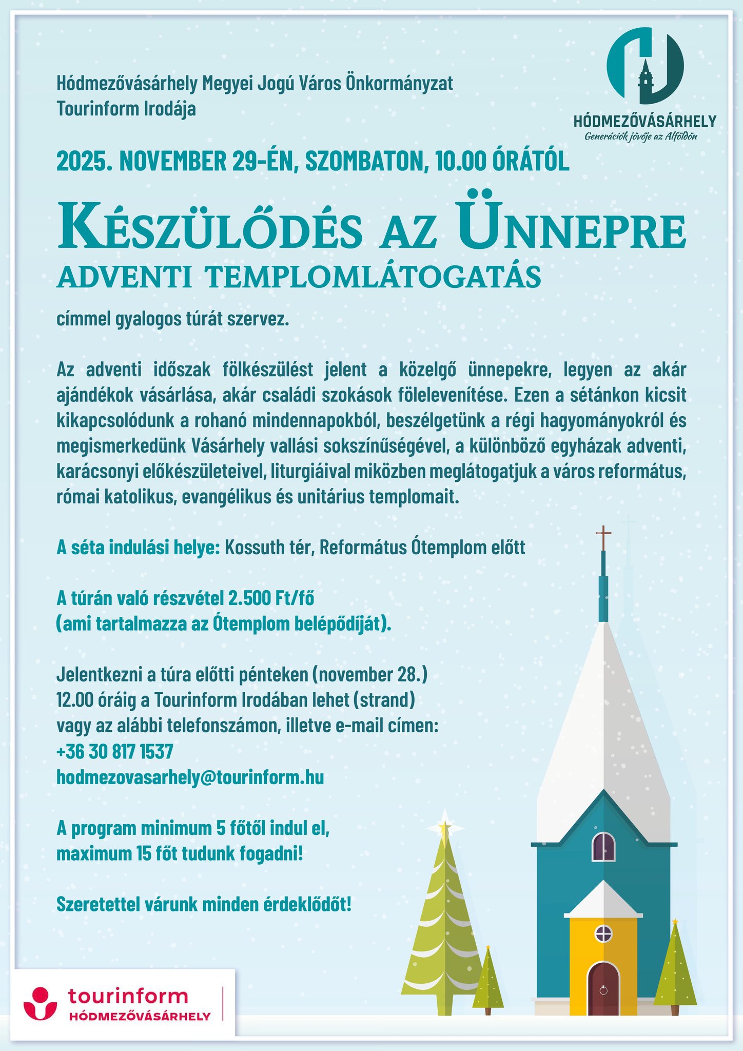 A program a Kossuth térről, a Református Ótemplomtól indul. Jelentkezni lehet a 30/817-1537-es számon, a hodmezovasarhely@tourinform.hu oldalon, illetve személyesen a Tourinform Irodában is, amely a téli időszakban a Török Sándor Strandfürdő területén, a büfével szemben található.