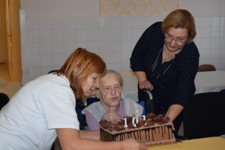 Marika nénit szívből köszöntötte Drubináné Fodor Katalin intézményvezető, Bereczki Hajnal intézményvezető-helyettes, Gera Katalin részlegvezető, Ökrösné Bába Etelka vezető ápoló, Székely Olga nappali szolgáltatás vezető, Móricz Mónika, a nagymágocsi SzSzK megbízott vezetője, Heredeáné Sprok Magdolna anyakönyvvezető, Magyarné Szűcs Krisztina, az ellátott gondnoka és az osztályon dolgozók.