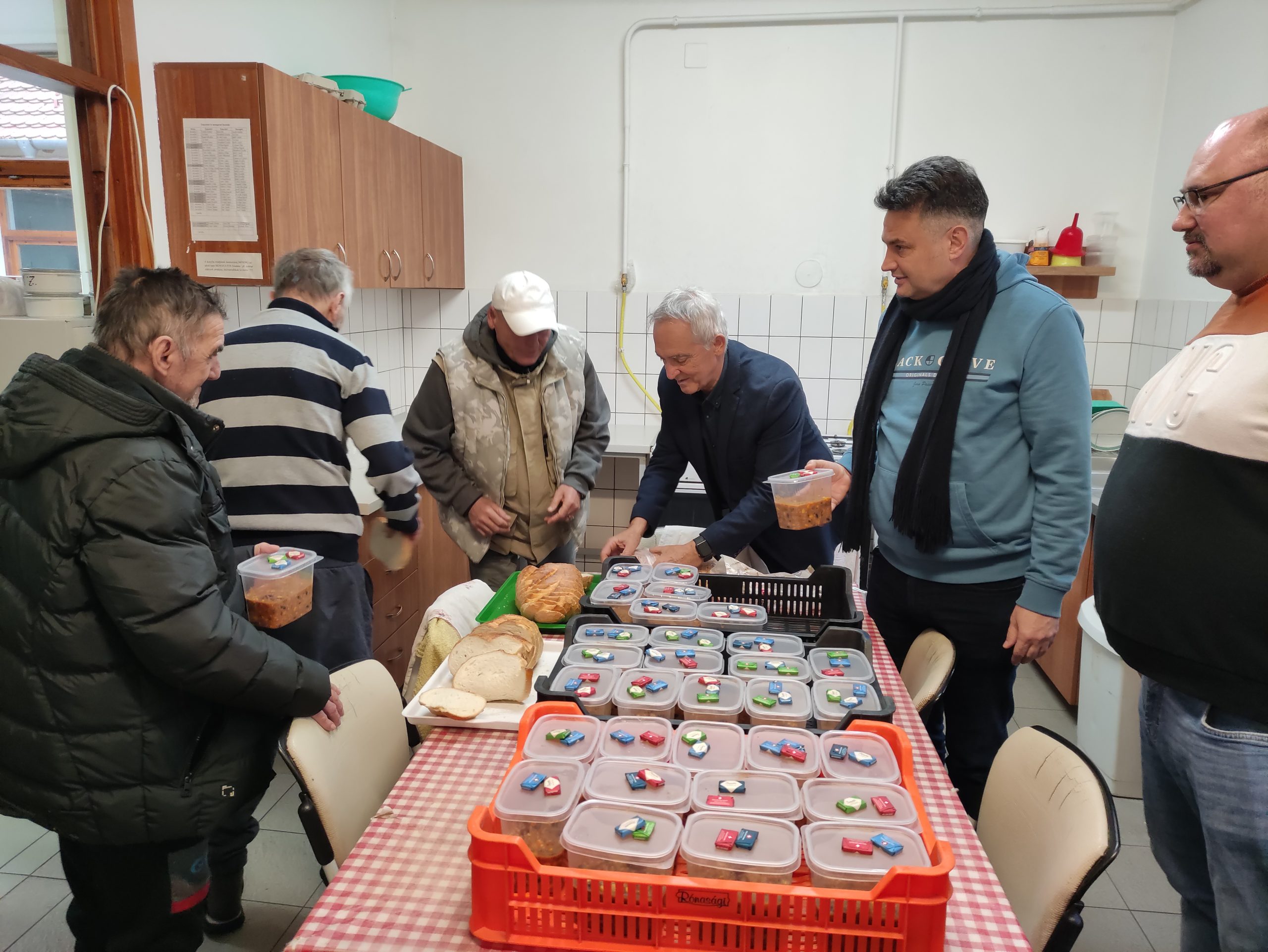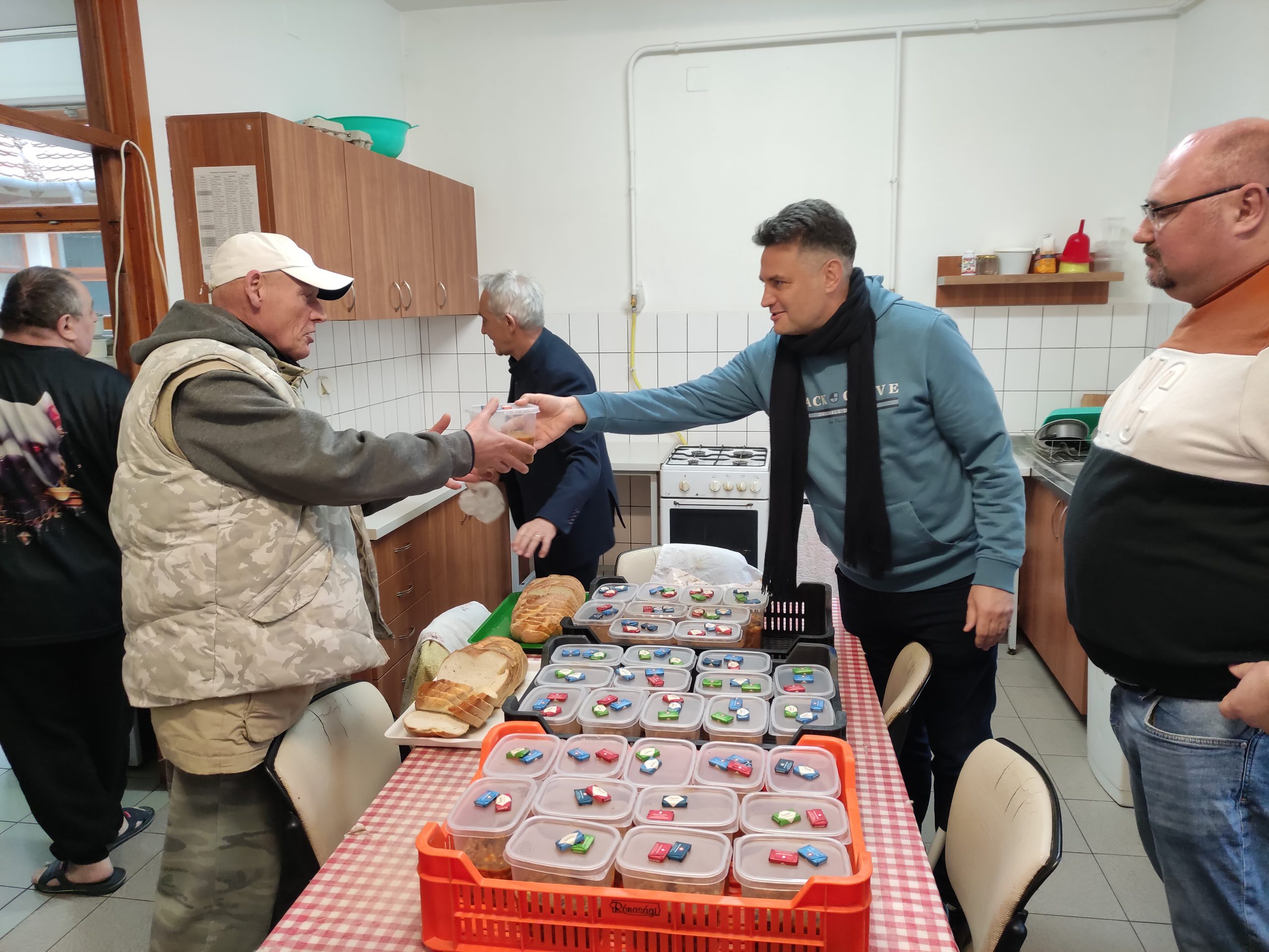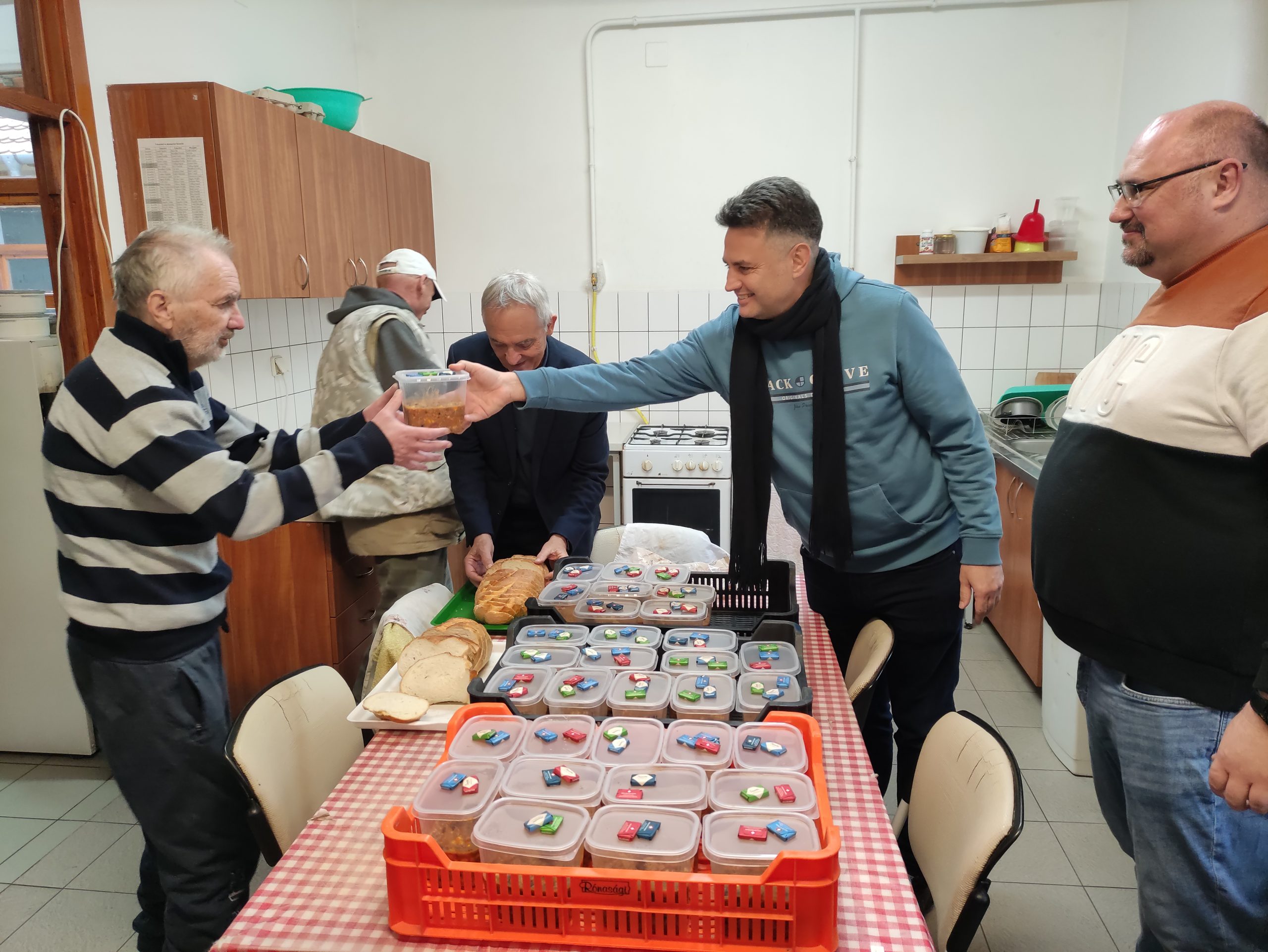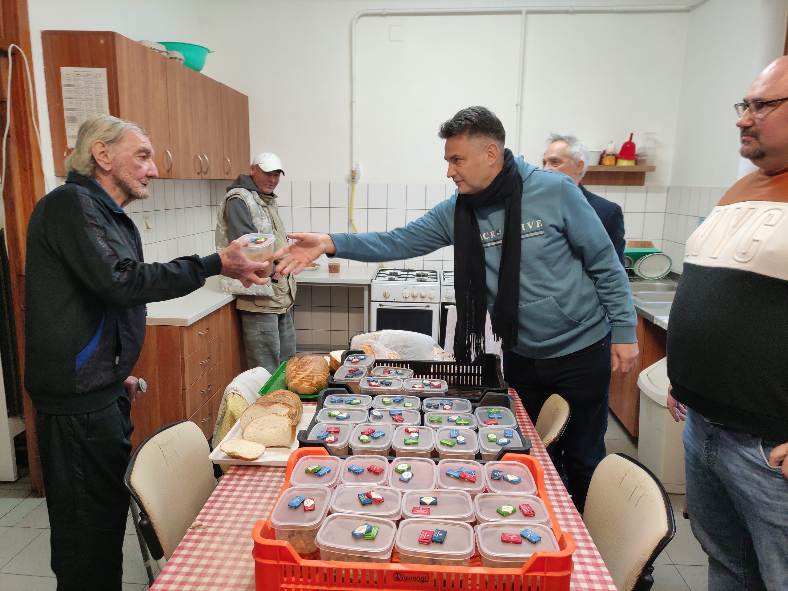 – Ez egy olyan alkalom, amikor nem a város, hanem mi magunk hozzuk az ajándékot, ahogyan szilveszterkor is rendszeresen ide látogatunk. Most Gyöngyösi Ferenc és barátai készítettek egy nagy adag chilis babot, amelynek alapanyagköltségét a két alpolgármesterrel együtt mi magunk biztosítottuk. Az ételt kenyérrel és svájci csokoládéval osztottuk ki. Fontosnak tartjuk, hogy a hajléktalanszálló lakóit az év végén két alkalommal is megajándékozzuk. Ez már a nyolcadik ilyen alkalom, hogy karácsonykor és szilveszterkor ellátogatunk ide. A legfontosabb az, hogy az itt élők is érezzék: attól, hogy nehéz szociális helyzetbe kerültek, a társadalom nem mondott le róluk. Segítséget és gondoskodást kapnak, és ami a legfontosabb, megbecsülést és szeretetet – mondta Márki-Zay Péter polgármester.