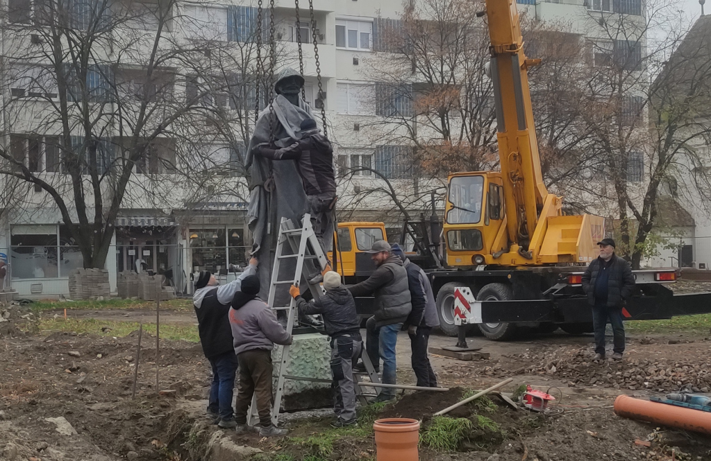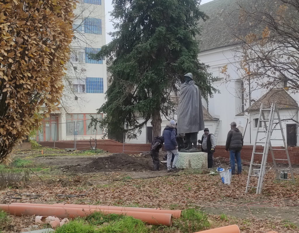 A Kossuth tér sarokház előtti része északi sarkáról az Ótemplom egykori védfalát jelölő emlékfal mellé helyezték át ma délelőtt a Szántó Kovács János szobrot.