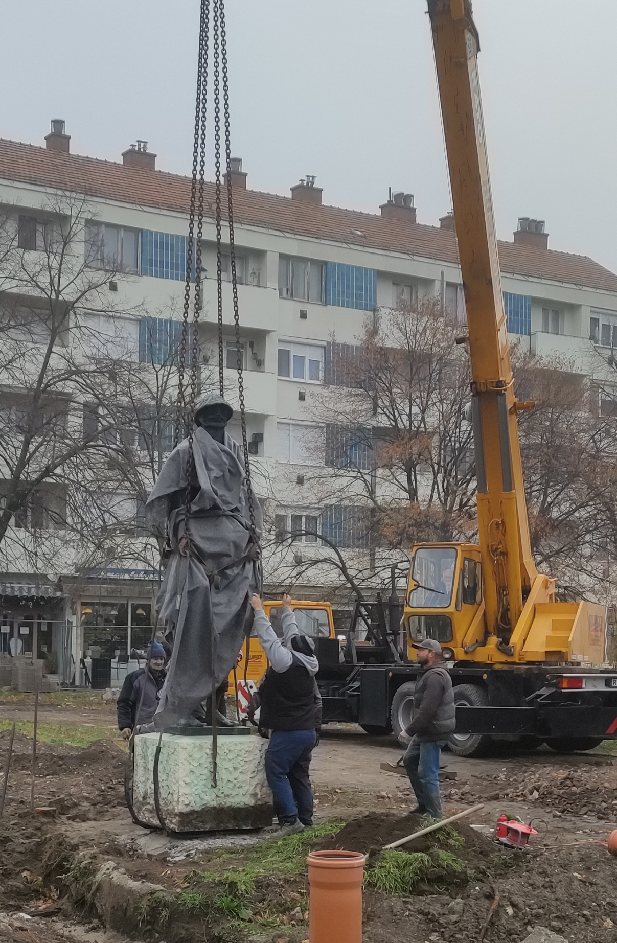 Bő két óra alatt – V. Nagy Nándor szobrász szakmai felügyeletével – a szakemberek és 25 tonnás daru segítségével áthelyezték a Kossuth tér sarokház előtti része északi sarkáról a Szántó Kovács János szobrot, a posztamenssel együtt az Ótemplom egykori védfalát jelölő emlékfal mellé, azaz a terület déli részére.