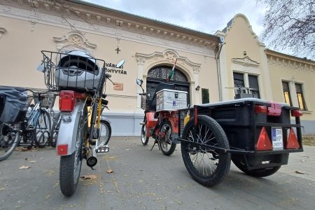 Babetták parkoltak a Németh László Városi Könyvtár előtt. Ezúttal nemcsak az előadók jöttek ilyen kismotorral, de a közönség lelkesebb tagjai közül is érkeztek a csehszlovák járgánnyal.