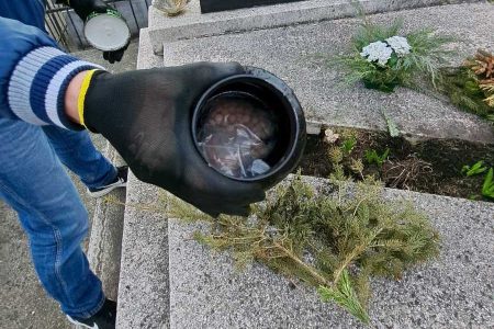 A síremlék koszorúkkal és fenyőágakkal letakart földje alól három kábítószerrel teli műanyagdoboz került elő, miután a rendőrök a nőt elfogták. Az étrendkiegészítős flakonokban összesen közel egy kilogramm fehér por volt, illetve közel 300, korona mintájú, rózsaszín tabletta, valamint több száz simítózáras tasak. Az elsődleges gyorstesztek alapján a por amfetamin, míg a tabletta extasy volt, de a részletes szakértői vizsgálatok még zajlanak.