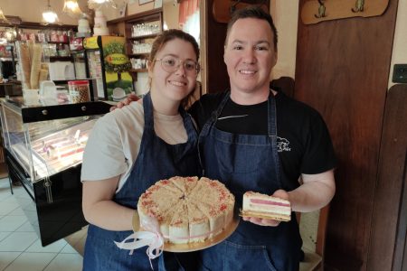 A glutén- és cukormentes, nyárias, eperízű tortával indul az Ország Tortája Versenyen a vásárhelyi Benczúr Sándor cukrászmester és a finomságot díszítő és részben (ízben) kitaláló Horváth Zsófia cukrásztanuló.