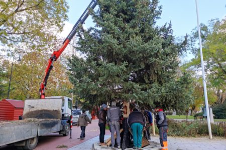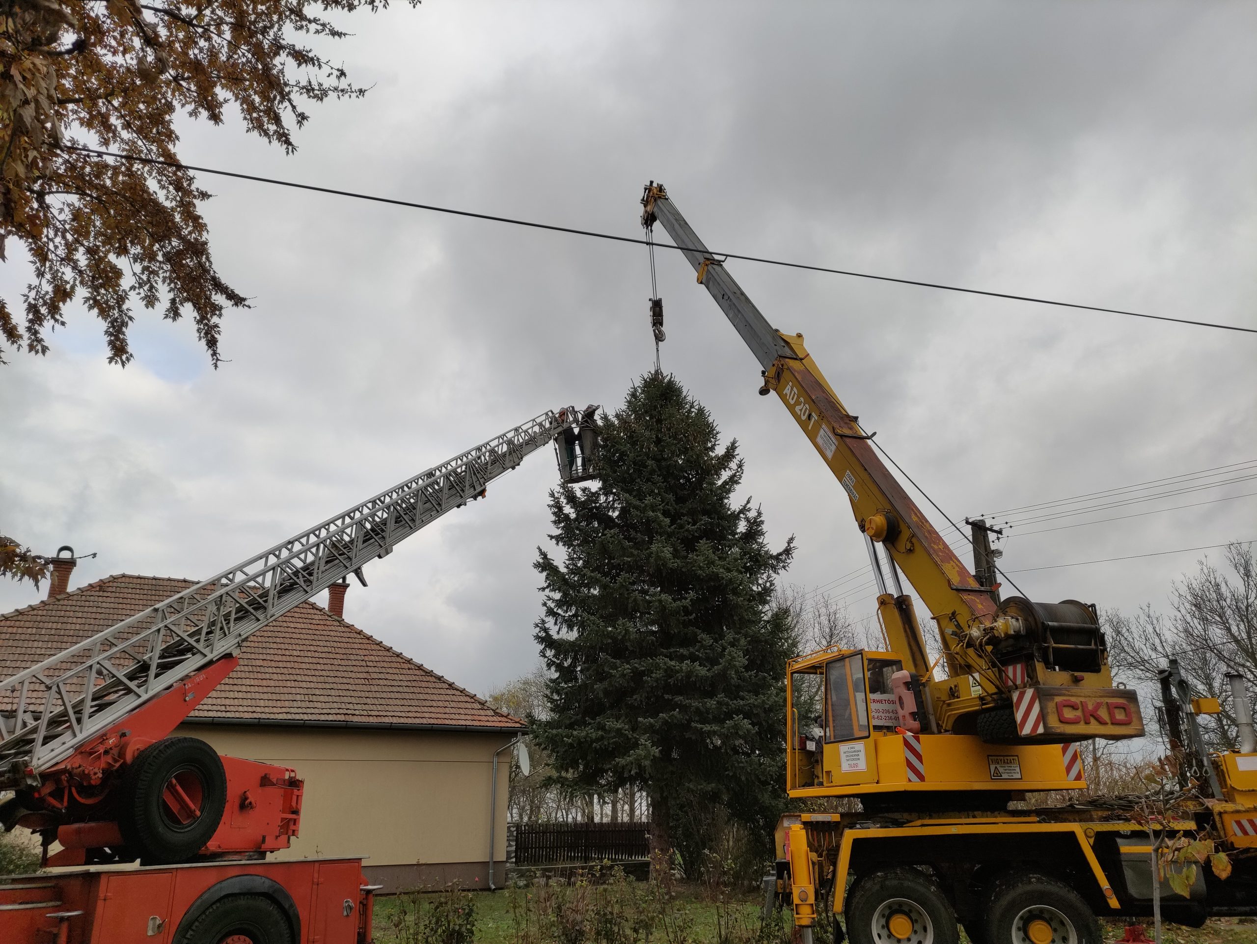 Ma délután vágták ki, és szállították a Kossuth térre ahol fel is állították (A címlapképen.) Az adventi koszorút is kihelyezték.